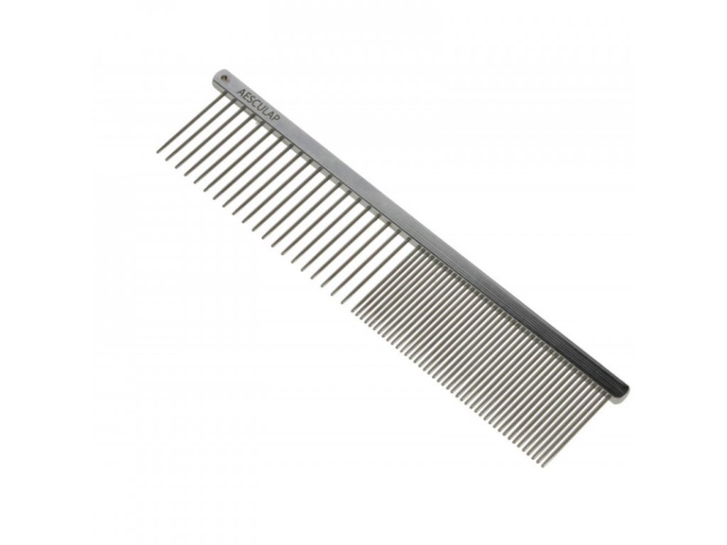 Hřeben na srst a hřívu Aesculap z nerezové oceli. Díky dvou částem je vhodný na česání všech délek i typů srsti. Vhodný také na vyčesávání podsady nebo protrhávání hřívy koní.