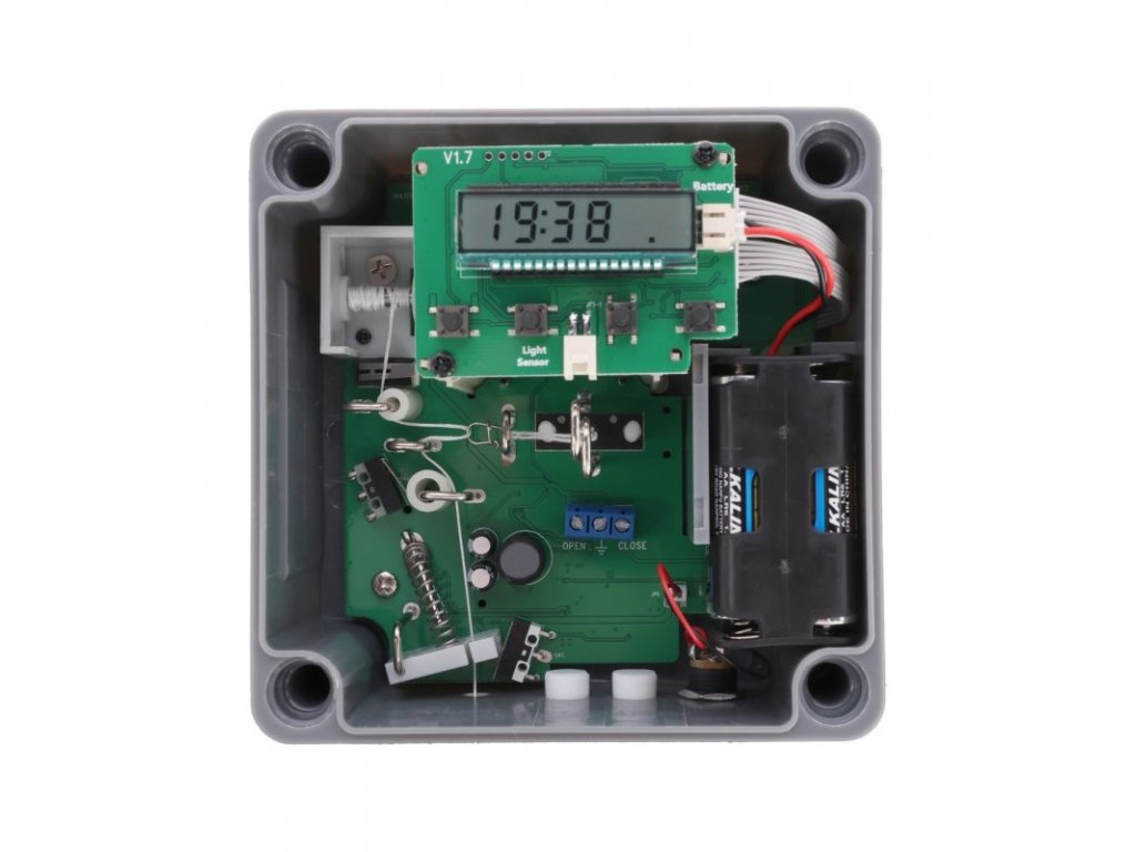 Instalace je velmi jednoduchá – jednotka je již připevněná k dvířkám. Stačí vše osadit na kurník, připojit senzor, nastavit časovač nebo světelný senzor a je hotovo.
