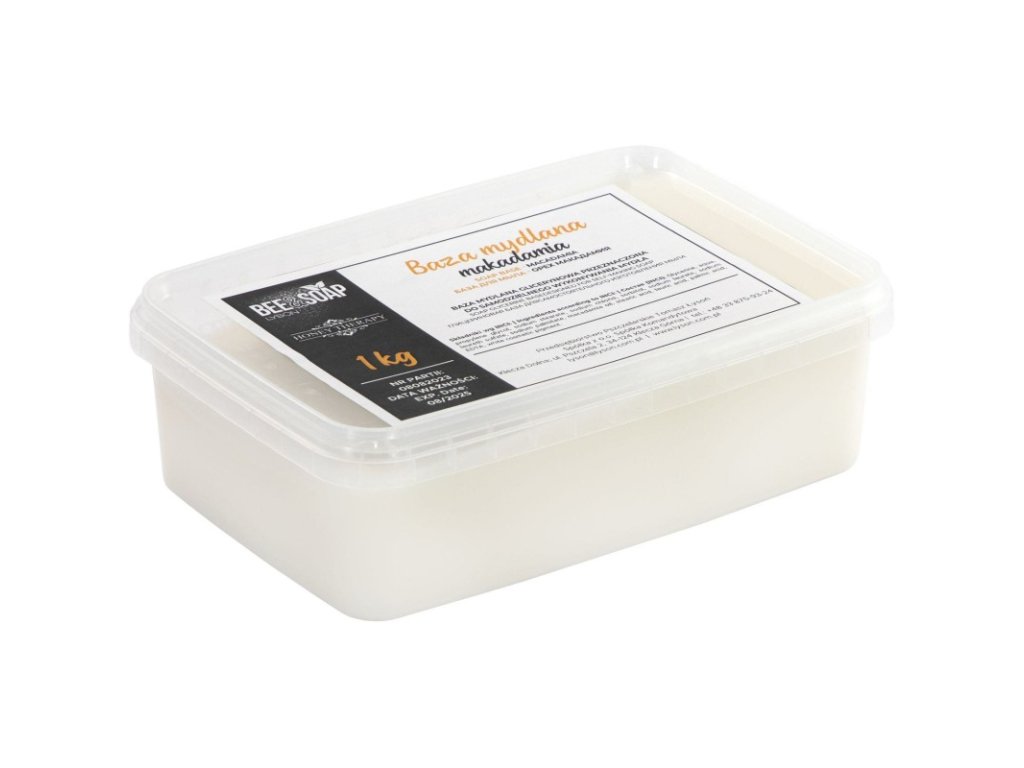 Báze mýdlová s makadamovým olejem — původní popis: Báze mýdlová s makadamovým olejem. Kvalitní báze mýdlová ideální pro chovatele včelaře i tvůrčí lidi vyrábějící svíčky a dekorativní produkty; vhodná jako hmota na výrobu mýdla a výchozí materiál pro mýdlová hmota postup zpracování, který umožňuje snadné barvení, parfemaci a doplňování přírodními přísadami.