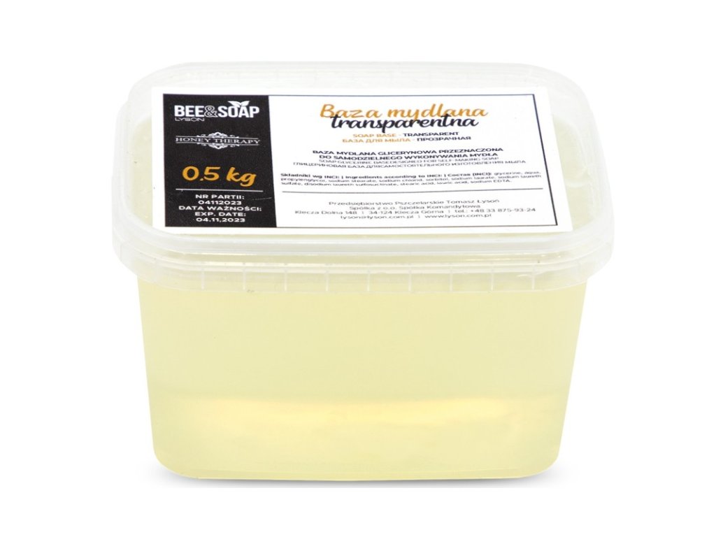 Báze mýdlová transparentní 0,5 kg. Transparentní báze mýdlová je ideální hmota na výrobu mýdla a kreativní projekty pro chovatele včelaře i tvůrčí lidi vyrábějící svíčky; snadno se zpracovává a umožňuje čisté, průhledné výsledky při mýdlová hmota postup zpracování s přidáním esencí, barev a dekorací.