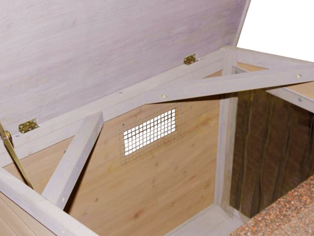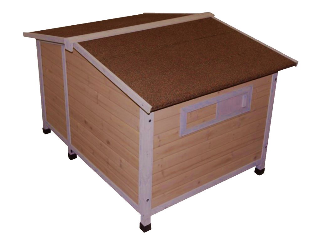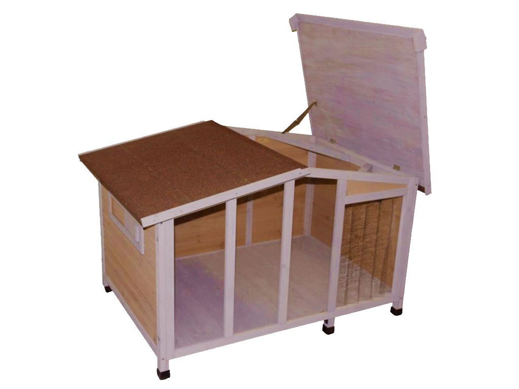 - Střecha boudy je pokrytá bitumenovou krytinou, která brání zatečení do boudy a udrží psa v suchu, bezpečně ukrytého před deštěm. Obe křídla střechy se dají odklápět, aby byl přístup do boudy při čištění a údržbě co nejpohodlnější.
