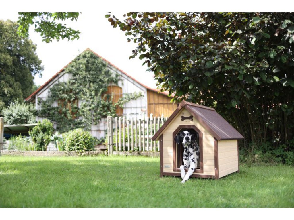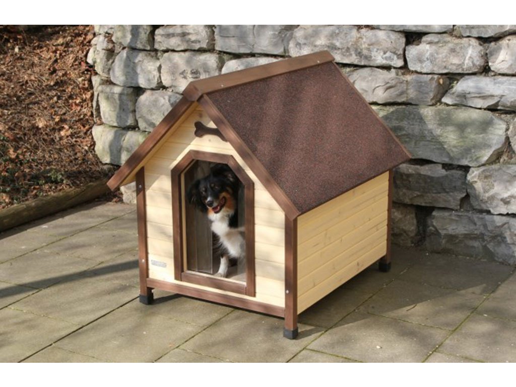 Bouda pro psa je vyrobena z lakovaného dřeva a poskytuje stabilitu a ochranu před nepřízní počasí.