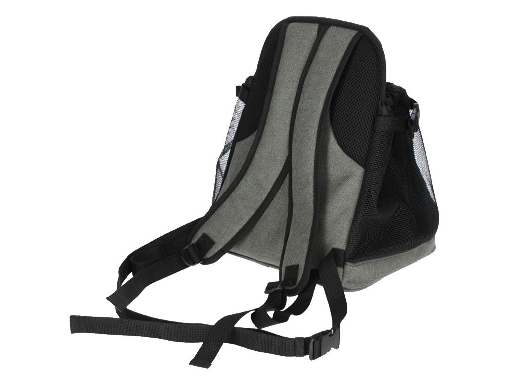 Cestovní batoh přední, pro psy/kočky s hmotností do 8kg, odolná tkanina Oxford, horní stahovací otvor, podložka s plyšovým potahem, polstrované ramenní popruhy, vyztužená zádová část, nastavitelný bederní popruh, s integrovaným fixačním vodítkem, 2 boční síťované vsadky, přední uzavíratelná úložná kapsa, rozměry 31x24x38 cm.