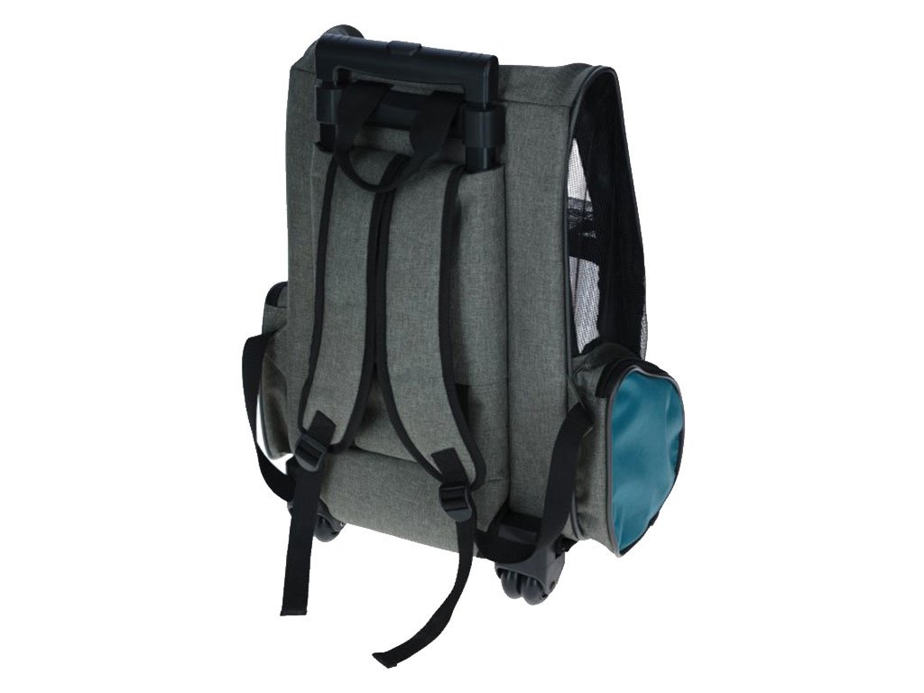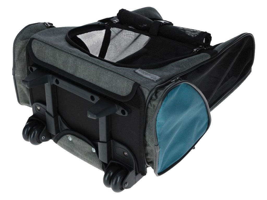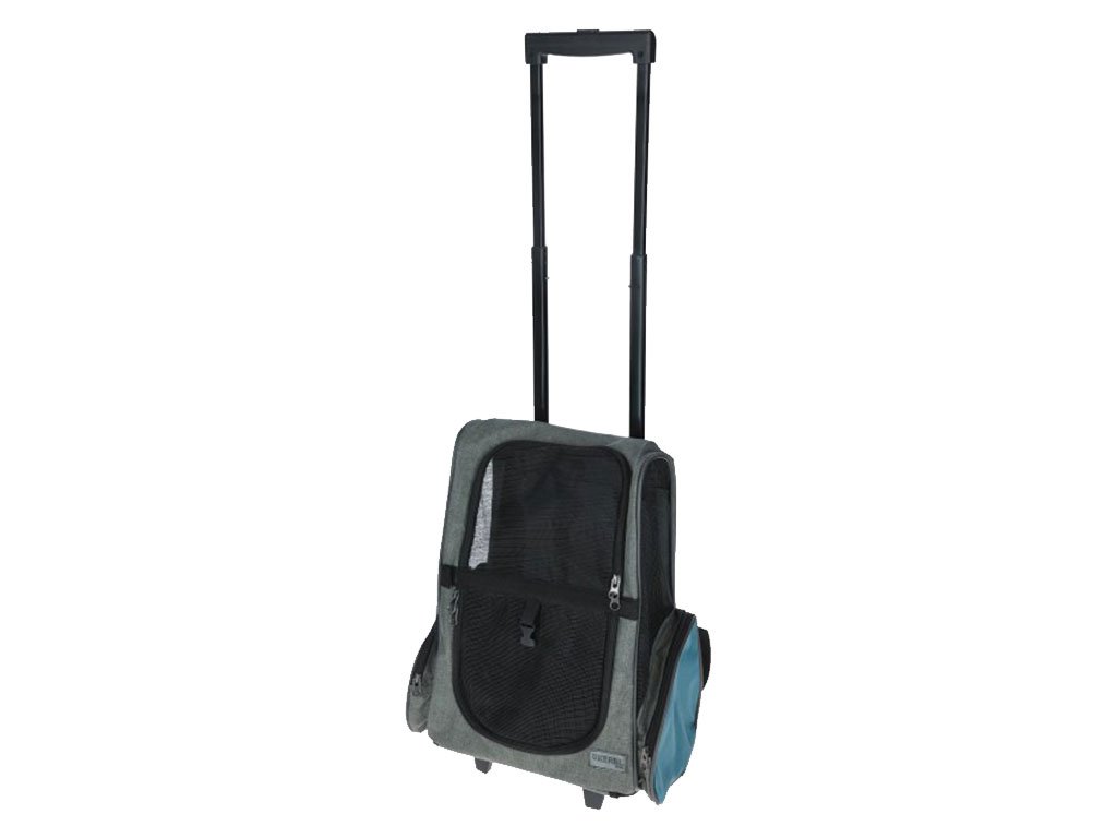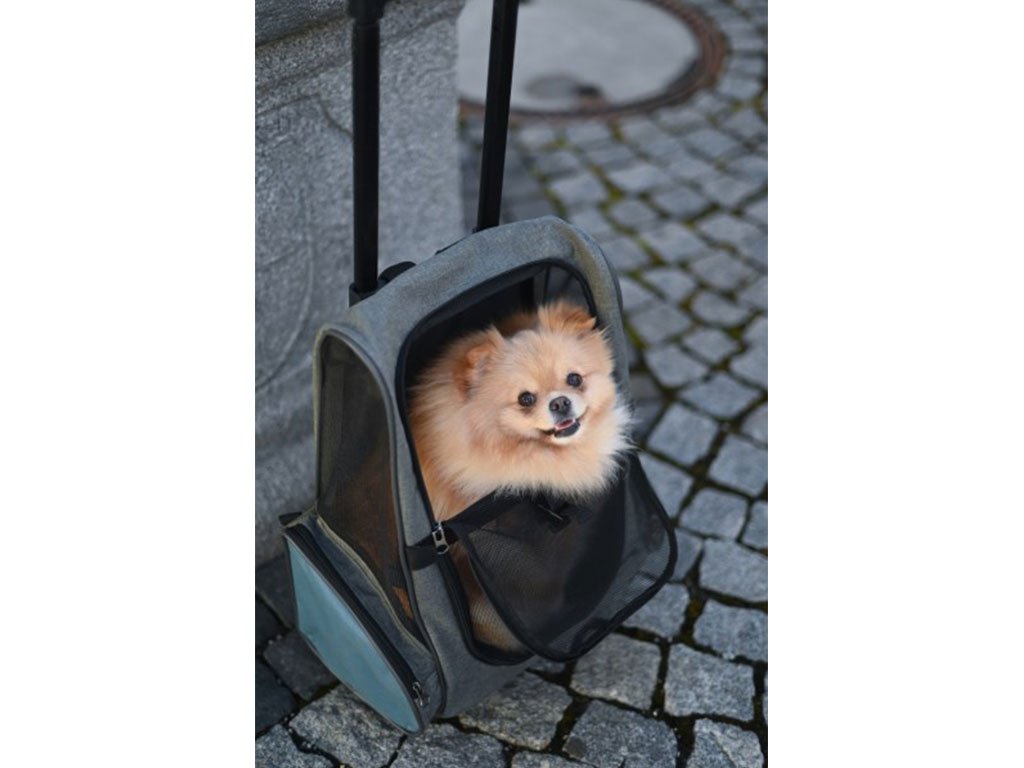 Cestovní taška na kolečkách, také batoh, nebo autosedačka, pro psy/kočky s hmotností do 10kg, teleskopické rameno (80/103cm), se 2 kolečky a 2 nožičkami, robustní rám s tkaninou Oxford, polstrované ramenní popruhy, s integrovaným fixačním vodítkem, upevňovací poutka pro pás v autě, přední otevíratelná síťka, 2 boční síťované vsadky, boční uzavíratelné úložné kapsy, rozměry 41x26x55 cm.