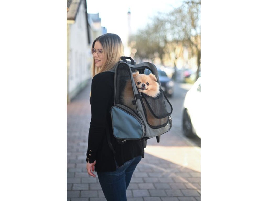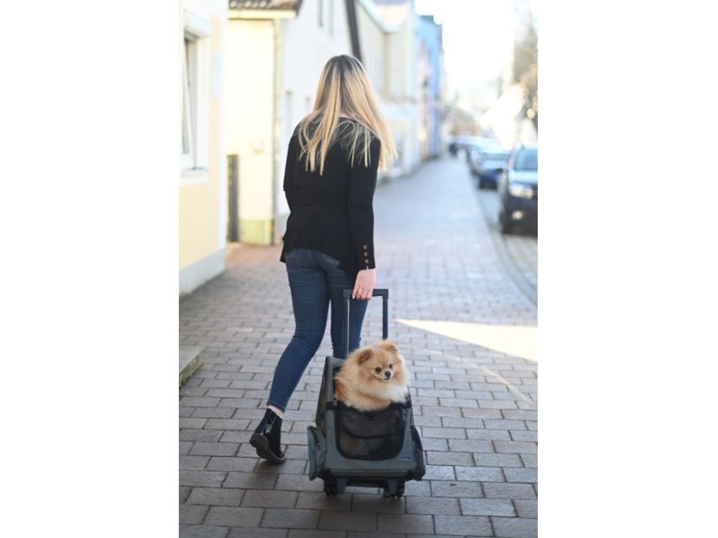 Taška Vás ohromí svou výbavou a skvělým provedením. Taška na dvou kolečkách a nožičkách slouží jako vozík, můžete si nastavit výšku teleskopické rukojetě (80/103 cm) pro snadné tažení tašky na kolečkách. Nastavitelné popruhy s polstrováním lze využít pro nošení jako batoh. Na tašce se nacházejí poutka pro pásy v autě a tak jí lze využít také jako autosedačku. Aby byl při cestování mazlíček v bezpečí, můžete ho připnout na krátké vodítko a v tašce uzavřít pomocí přední síťované vsadky, která zajistí mazlíčkovi skvělý výhled. Boční síťované vsadky zajistí optimální cirkulaci vzduchu. Na bocích tašky jsou úložné přihrádky, do kterých lze uložit pamlsky nebo vodítko. V případě, že zrovna nikam se psem necestujete, můžete tašku snadno uschovat.
