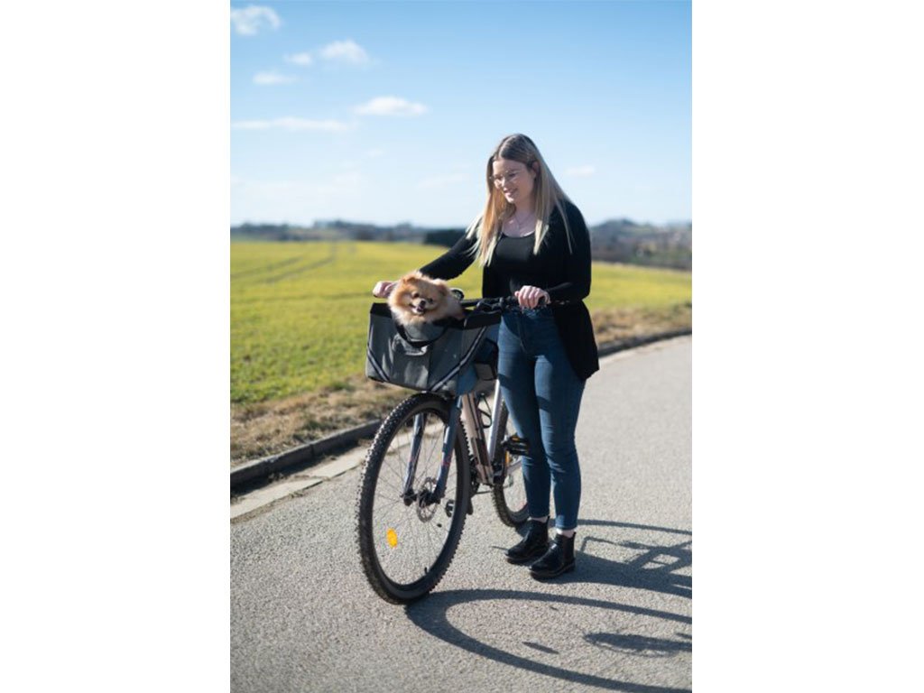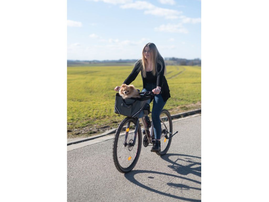 Cestovní taška na kolo, pro psy/kočky s hmotností do 7kg, s popruhy pro upevnění na řídítka, s vyztuženou základnou, s distančním držákem, s bezpečnostními odrazkami, odolná tkanina Oxford, s integrovaným fixačním vodítkem, podložka s plyšovým potahem, držák na láhev a přihrádky, rozměry 38x29x25 cm.