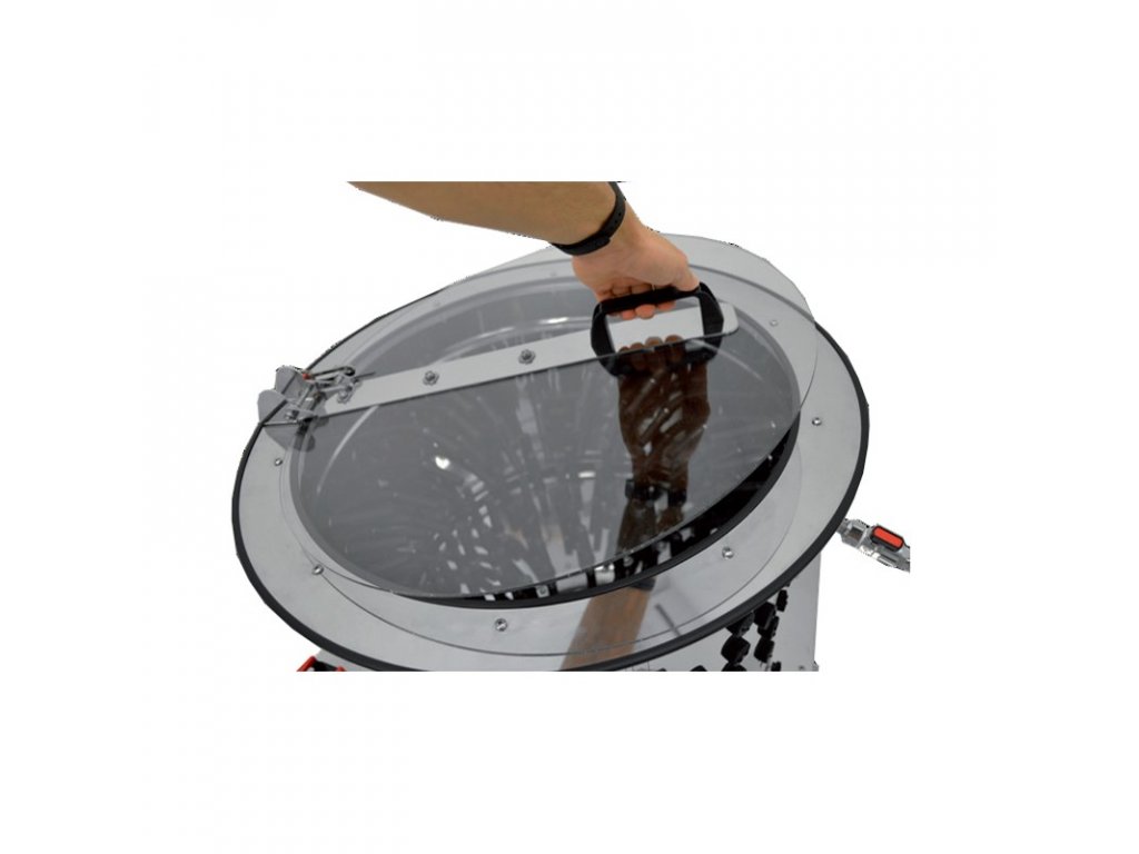 Transparentní víko umožňuje kontrolu procesu škubání. Škubačka je vybavena automatickou kontrolou uzavření víka – škubačka se nespustí, pokud víko není ve správné poloze. Rovněž je škubačka vybavena bezpečnostním systémem zastavení škubání, pokud je víko během procesu odklopeno.