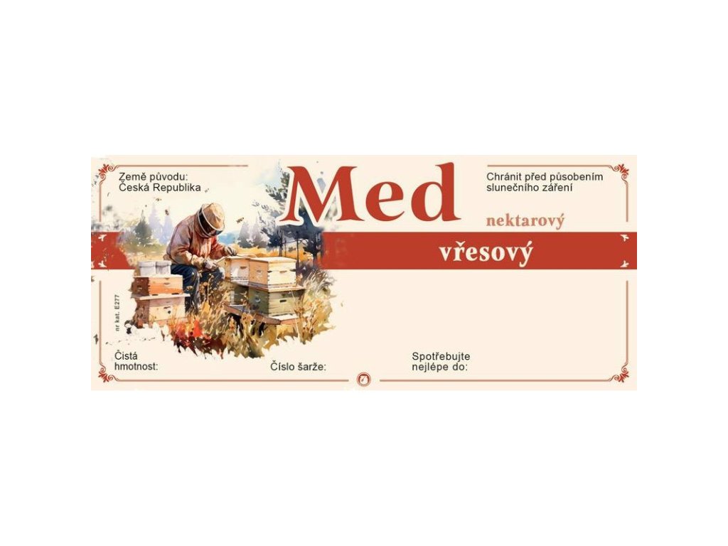 Charakteristika produktu: Rozměr: 116x50 mm – ideální pro menší a středně velké sklenice, zajišťující přehlednost a estetiku.Design: Různé vzory přizpůsobené každému druhu medu, zahrnující název druhu a prostor pro další informace (např. datum sběru, včelín).Materiál: Vysoce kvalitní samolepicí papír zajišťující trvanlivost tisku.Tisk: Živé barvy a přesný tisk, který zdůrazňuje přírodní charakter medu.Použití: Určeno jak pro hobby včelaře, tak pro profesionální včelí farmy. Výhody: Zdůrazněte přírodní a kvalitní charakter vašeho medu pomocí estetických štítků.Umožněte zákazníkům snadno identifikovat druh medu.Přidejte svým produktům profesionální vzhled, který je odliší na trhu. Objednávka a dostupnost:Etikety jsou k dispozici v sadách s hotovými vzory. Minimální objednávka: obal = 100 ks. Perfektní volba pro včelaře, kteří dbají na detaily!Buďte první, kdo napíše příspěvek k této položce.