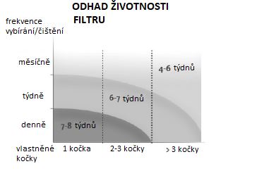 - Životnost filtru se liší podle umístění toalety, počtu koček a jejich stravovacích návyků.