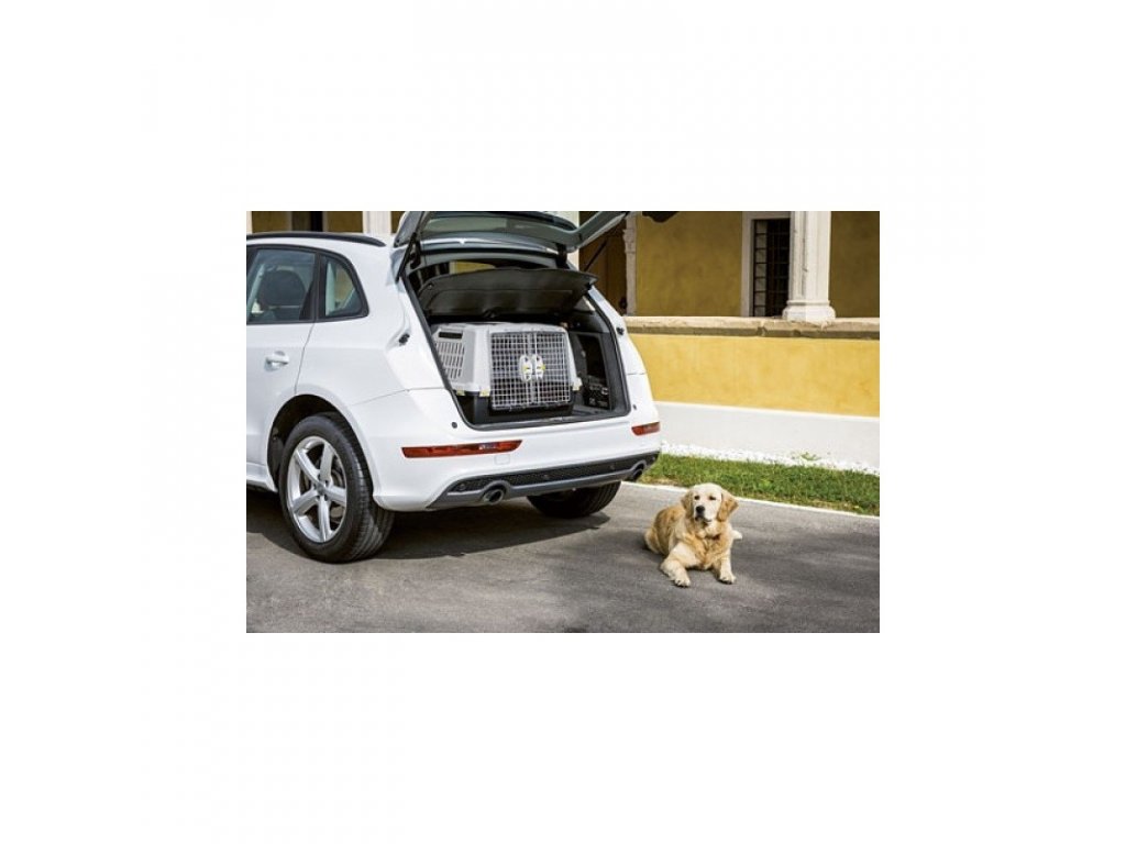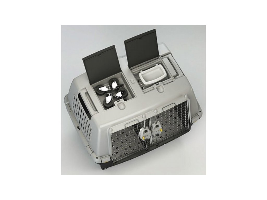 Pro možnost rozdělení přepravky pro dva psy doporučujeme ještě přikoupit dělící panel a cestovní misku pro druhého psa.