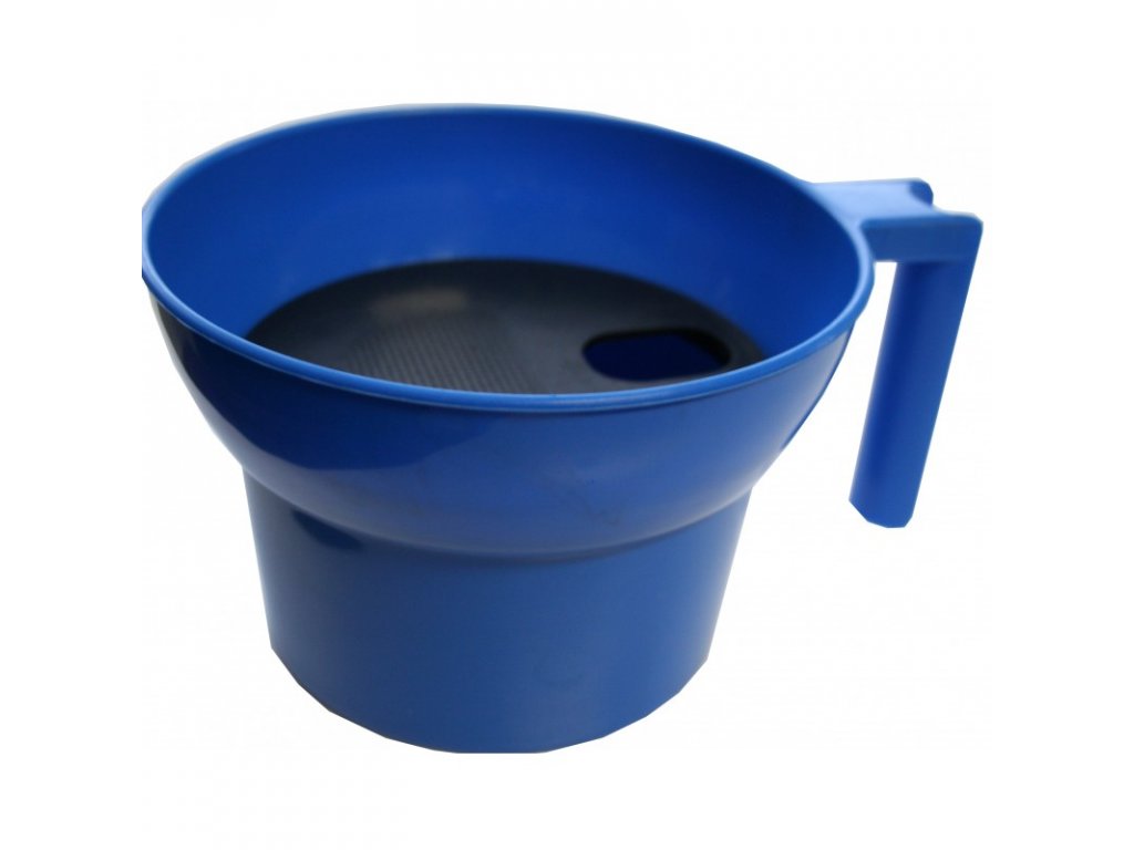 Oddojovací hrnek s černým sítkem, pro kontrolu prvních odstřiků mléka z každého struku. Černé sítko umožňuje dobrou viditelnost mléčných hrudek, odhalujících zánět vemene - mastitidu.