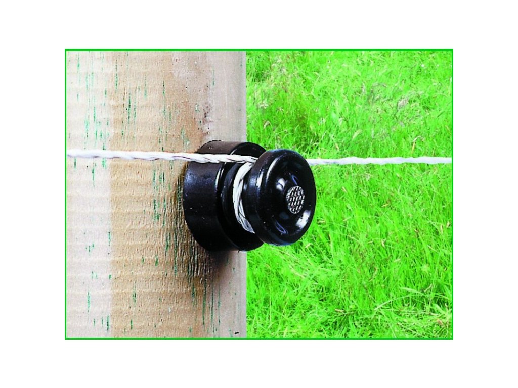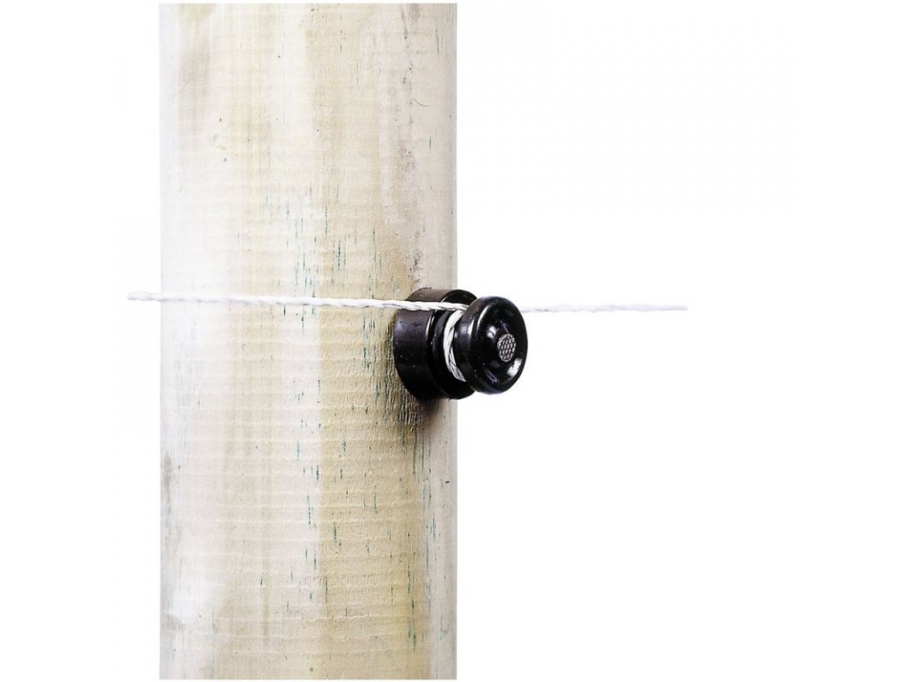 Prstencový izolátor pro elektrické ohradníky určený k uchycení na dřevěný kůl hřebíkem nebo vrutem.