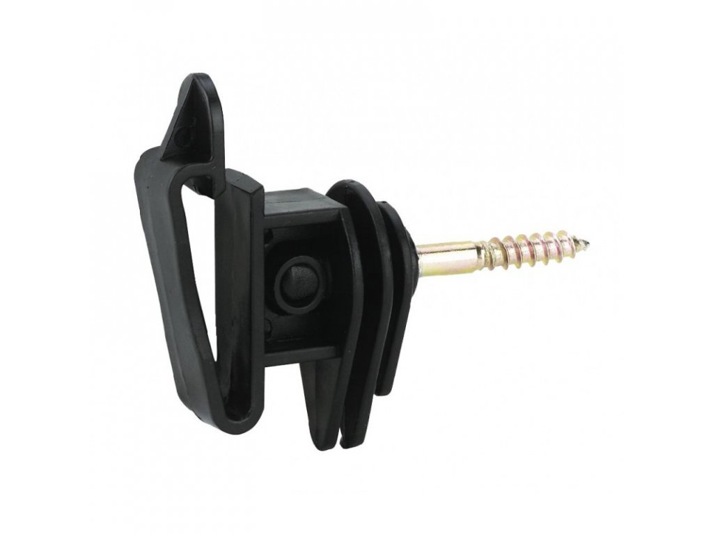 Páskový průběžný izolátor s vrutem, určený k přichycení vodiče k dřevěnému sloupku pomocí plastového klipsu.
