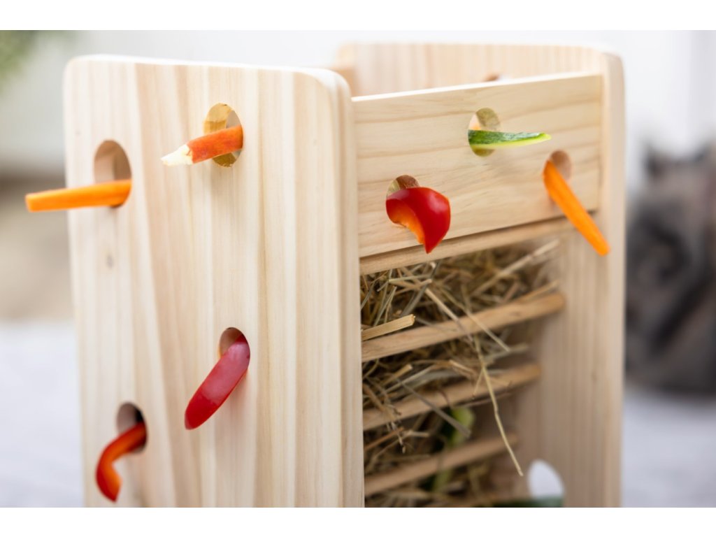 Horní část věže slouží jako zásobník na seno, který lze snadno doplňovat shora. Po stranách je umístěno 13 otvorů různých velikostí, kam můžete vložit kousky zeleniny – např. mrkev, papriku, ledový salát nebo jablko. Zvířata musí použít svou šikovnost, aby se k dobrotám dostala, což jim přináší mentální stimulaci a zabavení.