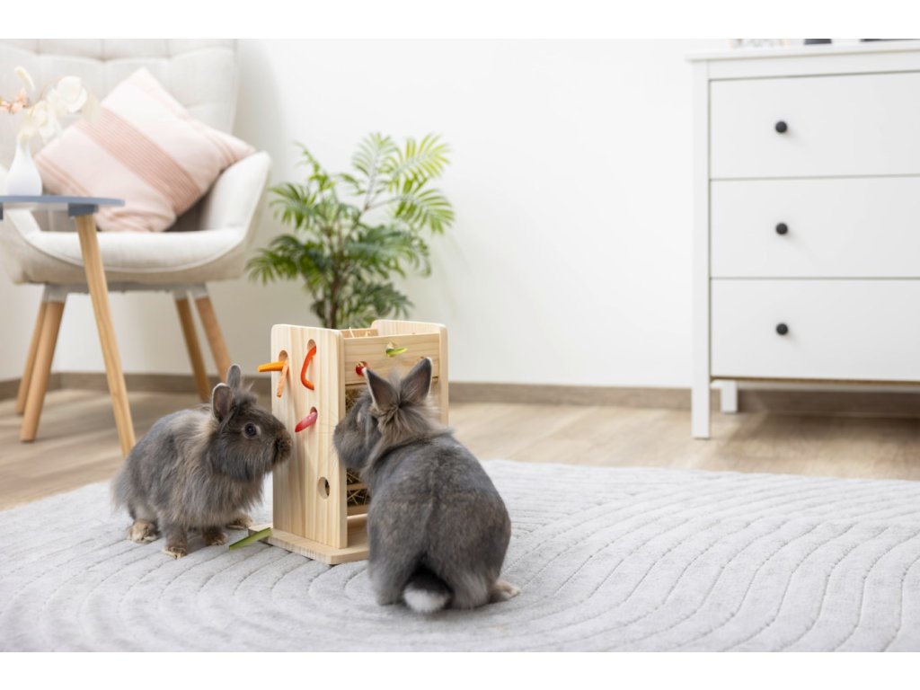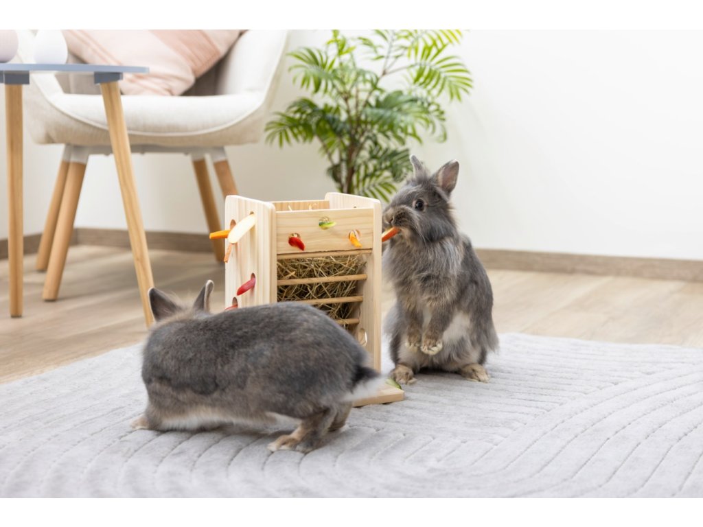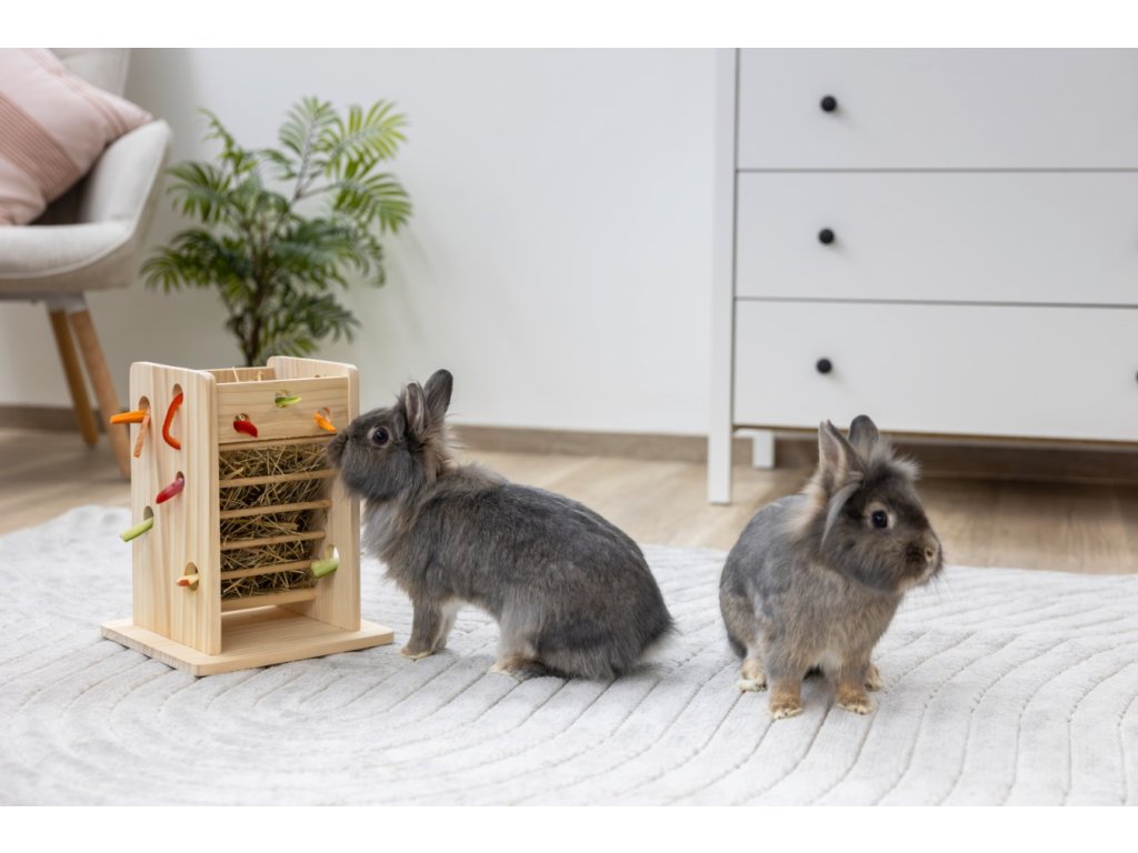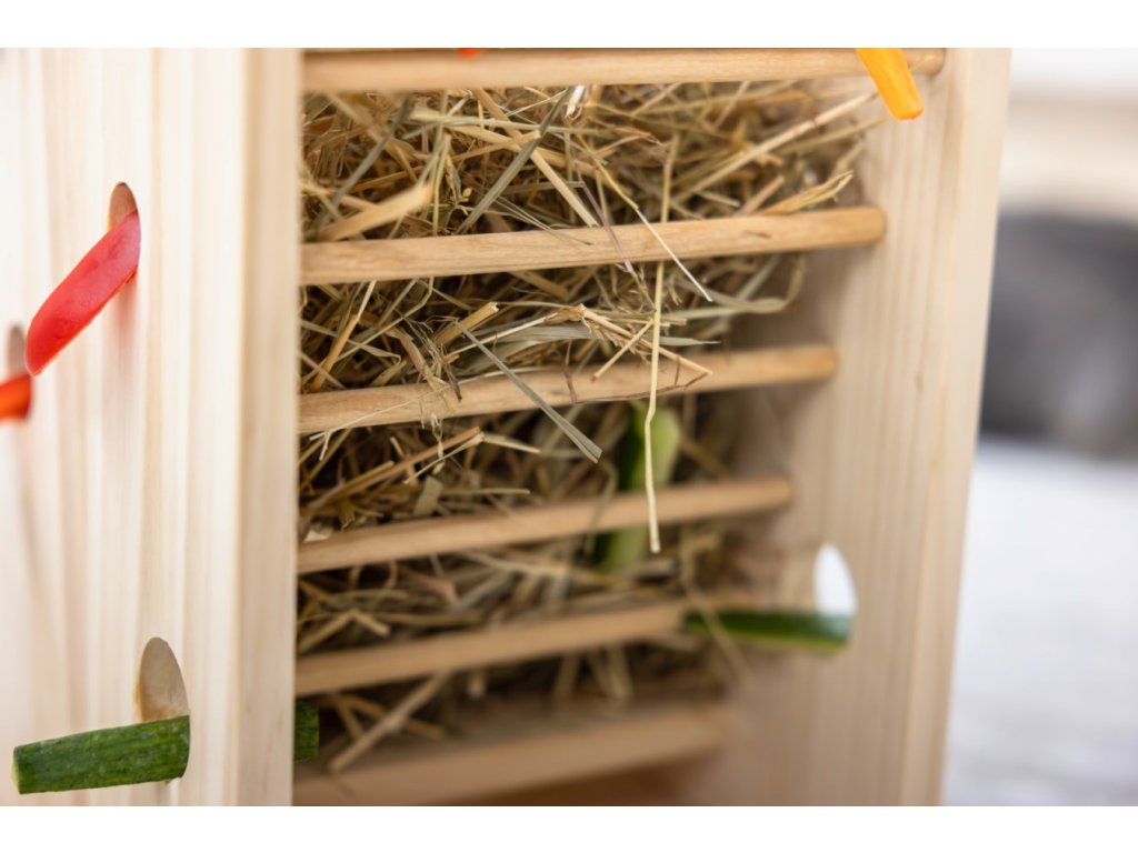 Do otvorů můžete vložit čerstvé plátky mrkve, papriky, salátu nebo okurky. Kombinace sena a zeleniny zajistí zábavu i vyváženou stravu. Umístěte krmítko do klece nebo výběhu tak, aby bylo pro mazlíčky snadno dostupné, ale zároveň stabilně stálo.