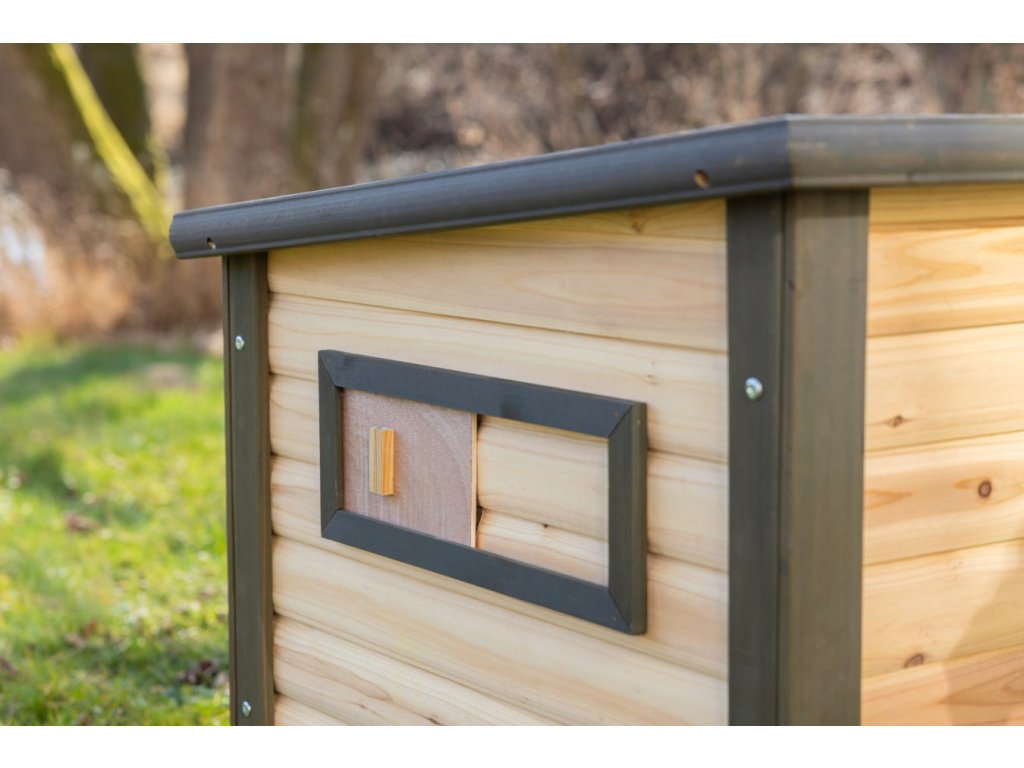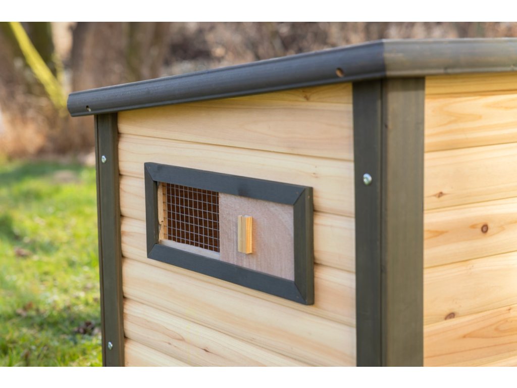 Venkovní kachník DUCK TOWN XL je prostorný a odolný přístřešek určený pro menší chovy slepic, kachen nebo hus. Konstrukce z jedlového dřeva s ochranným nátěrem zajišťuje stabilitu a dlouhou životnost i při venkovním použití. Střecha z voděodolného bitumenového materiálu chrání před deštěm a větrem, zatímco výsuvná pozinkovaná vana umožňuje rychlé a snadné čištění. Díky plastovým nožkám je kurník chráněn před vlhkostí a dvojitý zámek na dvířkách poskytuje bezpečí proti predátorům. Praktické posuvné větrací okénko zajišťuje optimální cirkulaci vzduchu a zdravé klima uvnitř.