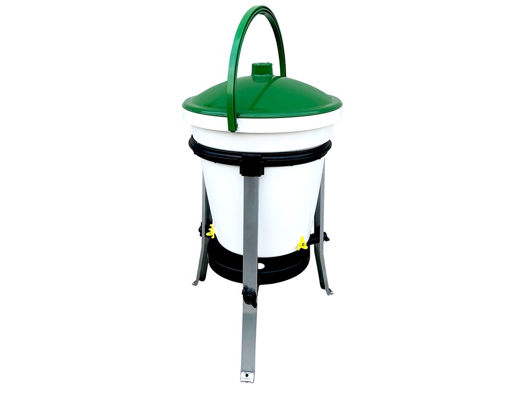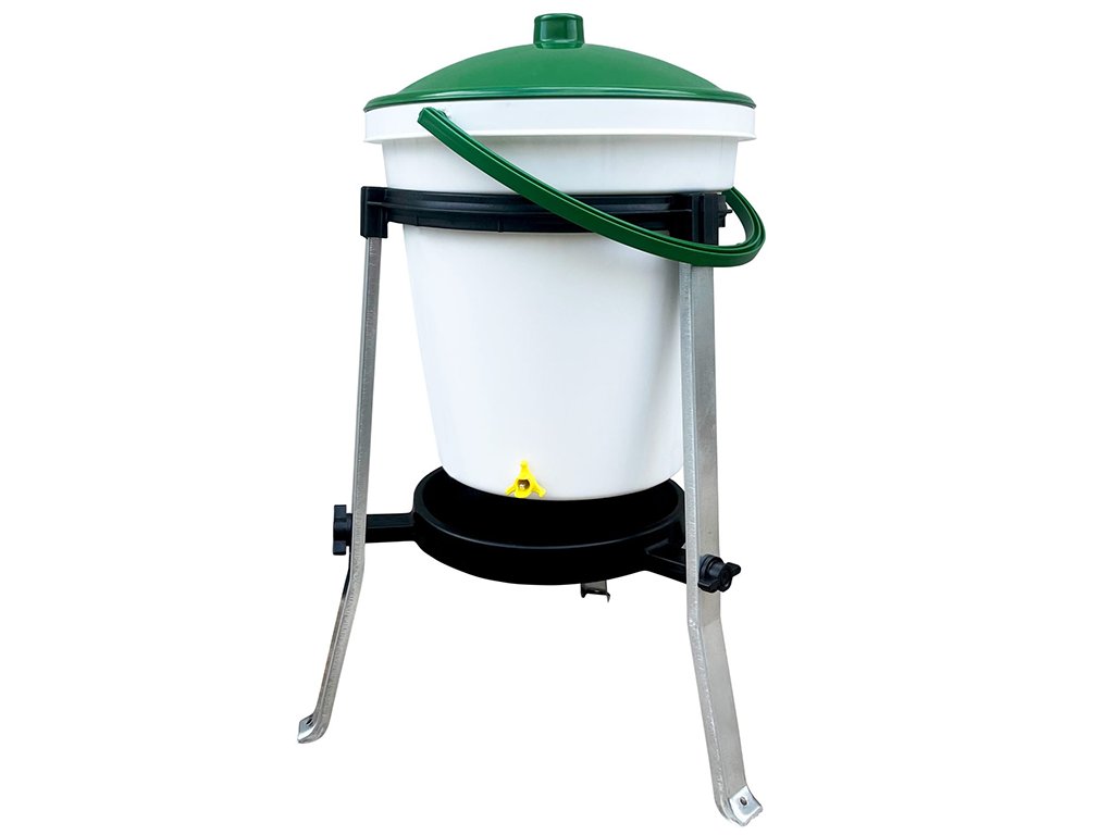 Kbelíková napáječka, pro slepice, drůbež, vědro z kvalitního plastu, robustní kovová konstrukce - nohy, snadná údržba, objem 17 l, rozměry 33x33x65,5 cm.