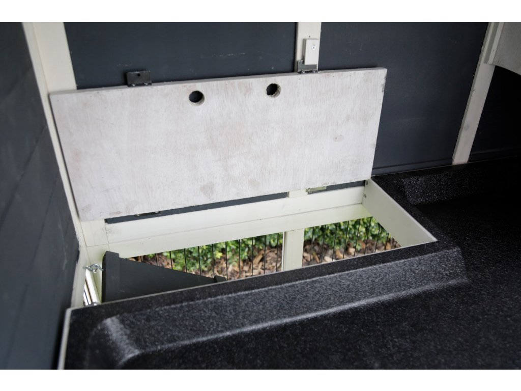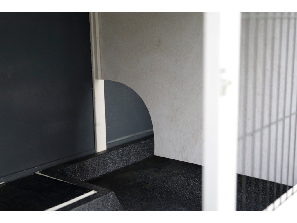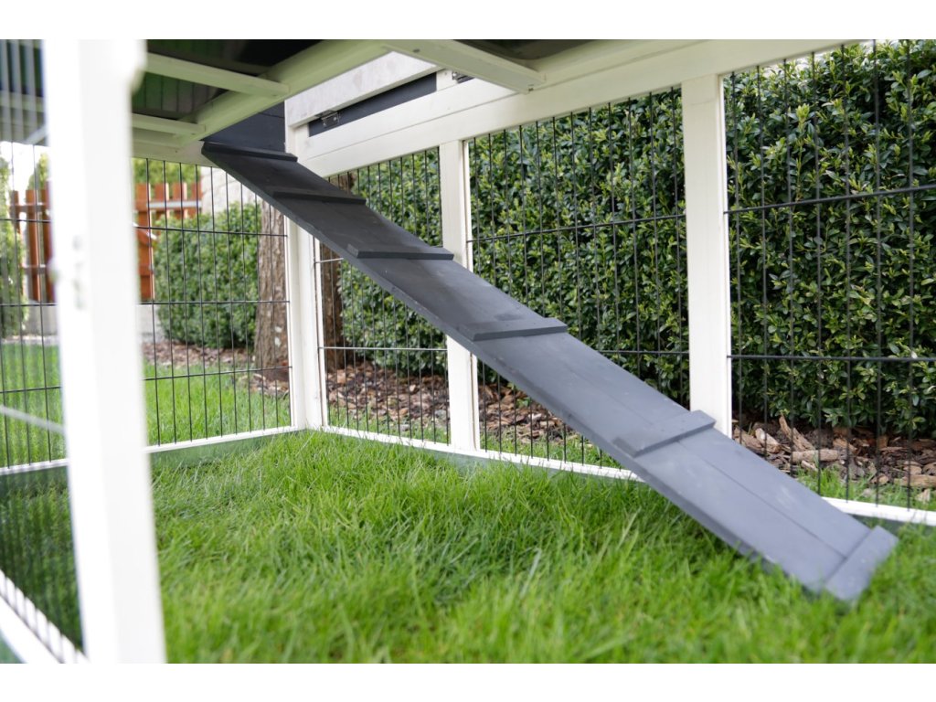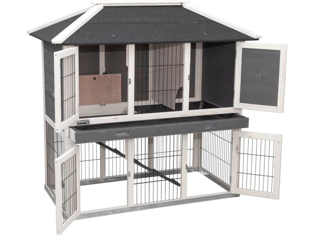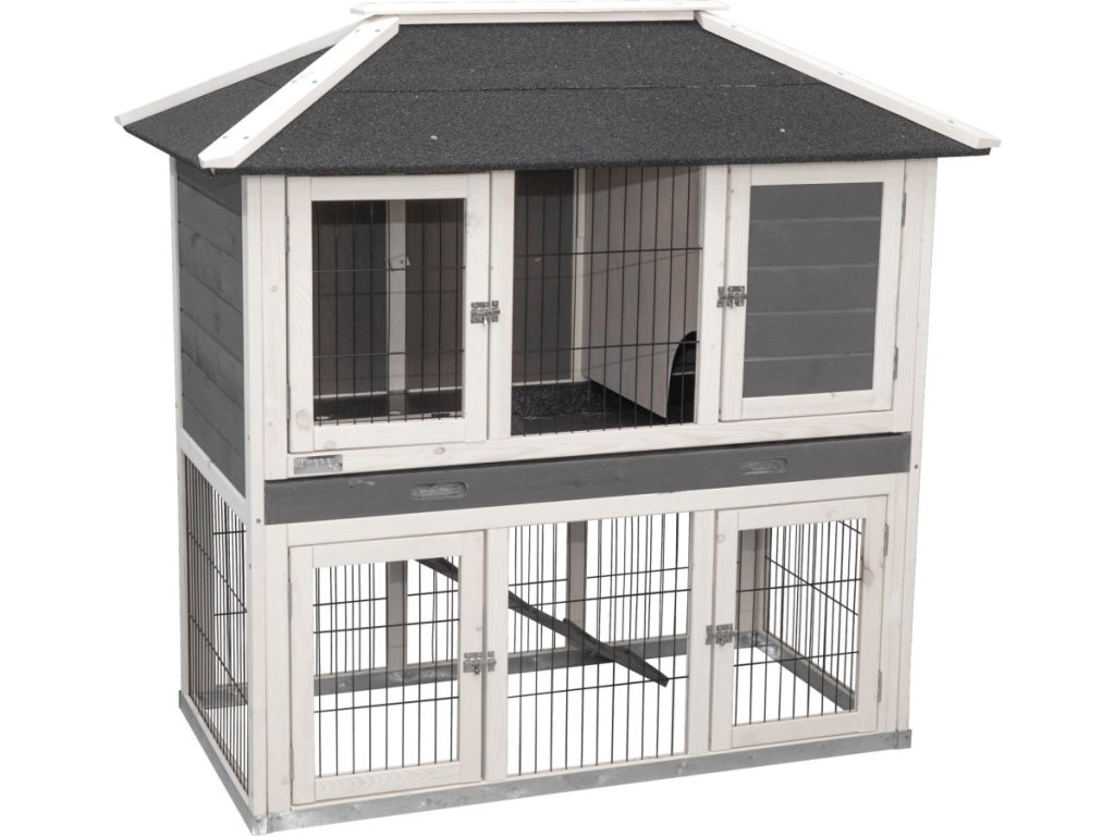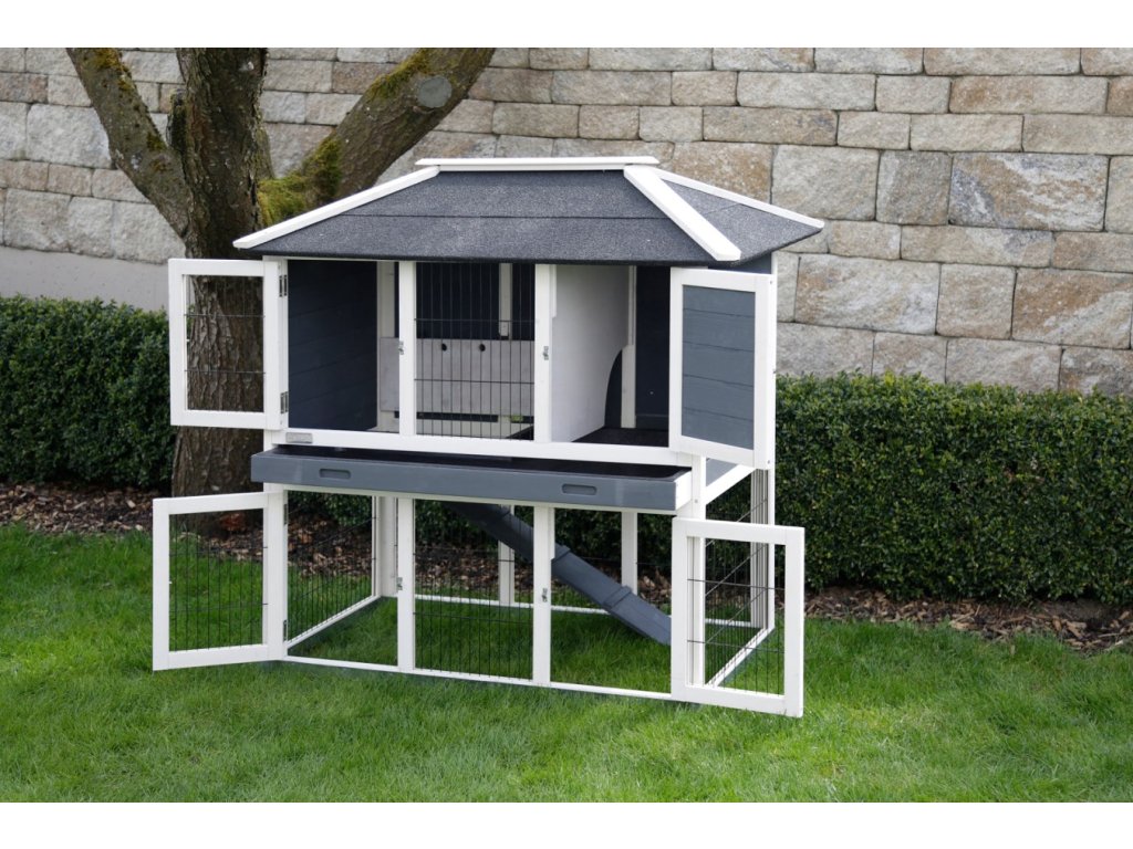 Králíci mají k dispozici dvě úrovně – prostorný domek a spodní výběh propojený rampou. Konstrukce umožňuje bezpečný pohyb mezi patry a možnost uzavření vchodu mezi kotcem a výběhem. Díky výsuvné plastové vaně je údržba snadná a rychlá.