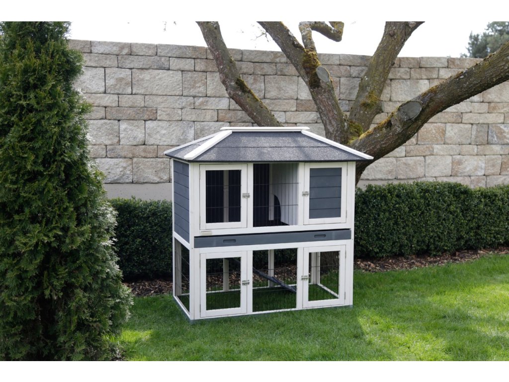 Venkovní králíkárna Villa v designu zahradní vily je ideální pro králíky, morčata a jiné hlodavce. Kombinuje útulný domek s valbovou střechou a prostorný spodní výběh. Díky modernímu šedobílému provedení zapadne do každé zahrady a poskytne vašim mazlíčkům bezpečný a pohodlný domov.