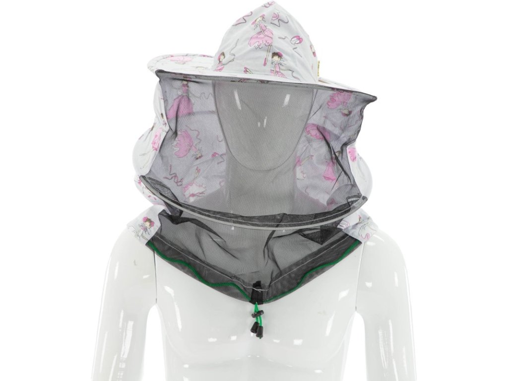 Včelařský klobouk s roztomilým motivem baletek spojuje estetiku a bezpečnost, díky čemuž je ideální pro malé včelařky a milovnice tance. Hustá síťka v přední části chrání obličej před včelami, zároveň poskytuje dostatečné větrání a dobrou viditelnost. Zadní a horní část klobouku jsou ušité z přírodní bavlny, která zaručuje pohodlí, jemnost k pokožce a ochranu před sluncem. Bavlněná zadní část zakrývá šíji, zatímco nastavitelná šňůrka pod bradou drží klobouk stabilně na hlavě i při hře. Motiv baletek dodává klobouku výjimečný, dívčí charakter a povzbuzuje děti k jeho nošení při práci u včel.