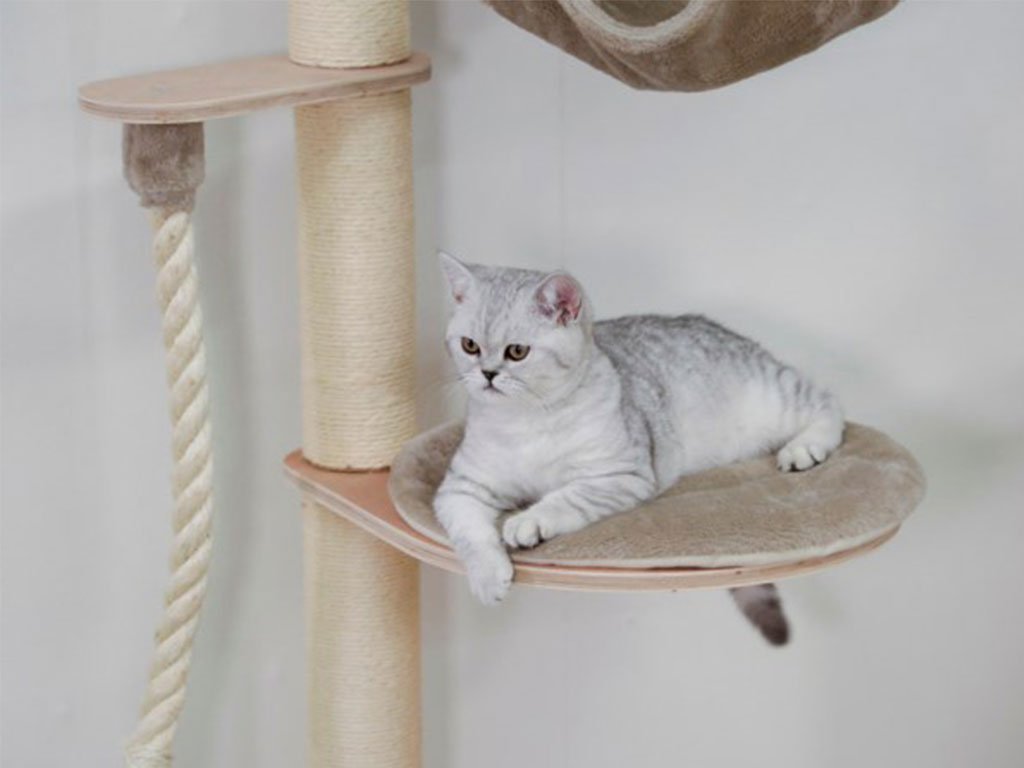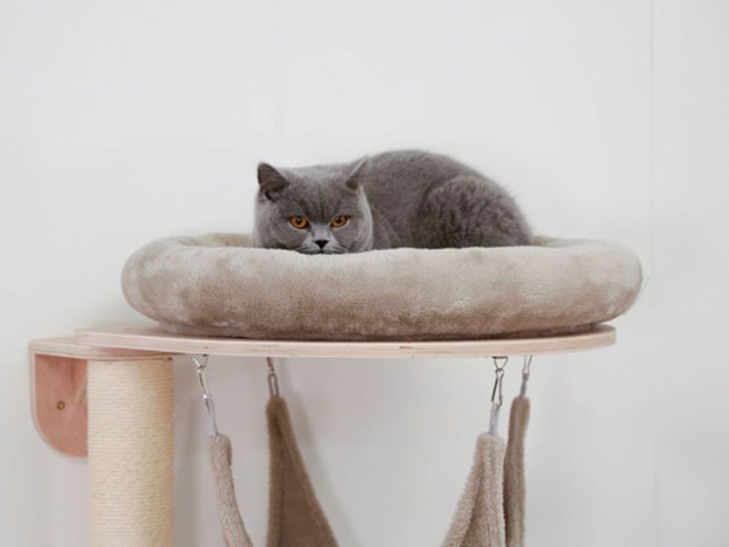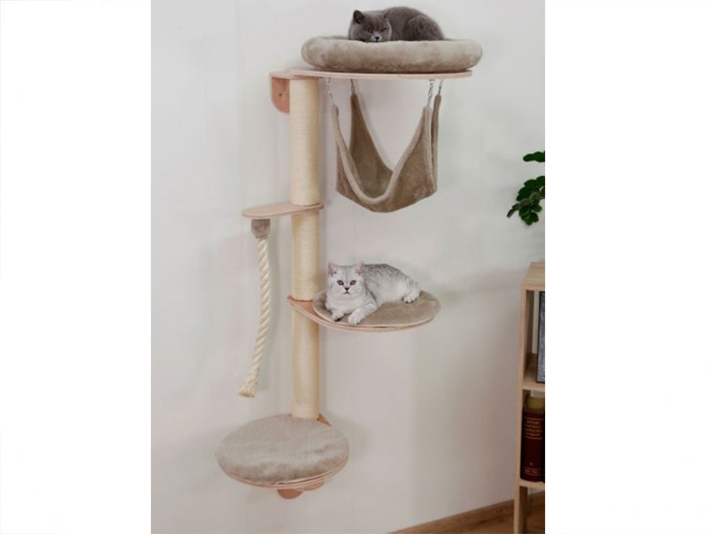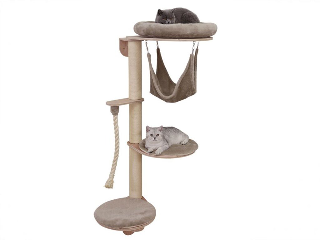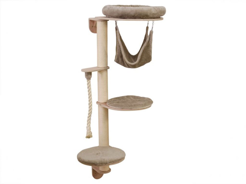 Nadčasové dřevěné škrabadlo pro kočky na zeď s houpacím odpočívadlem. Montáž na stěnu do libovolné výšky, tři patra s pelíšky s odnímatelnými polštáři, schůdek, sisalový sloupek a provaz pro šplhání i broušení drápků. Kočičí strom je 158 cm vysoký a disponuje nosností do 9 kg.