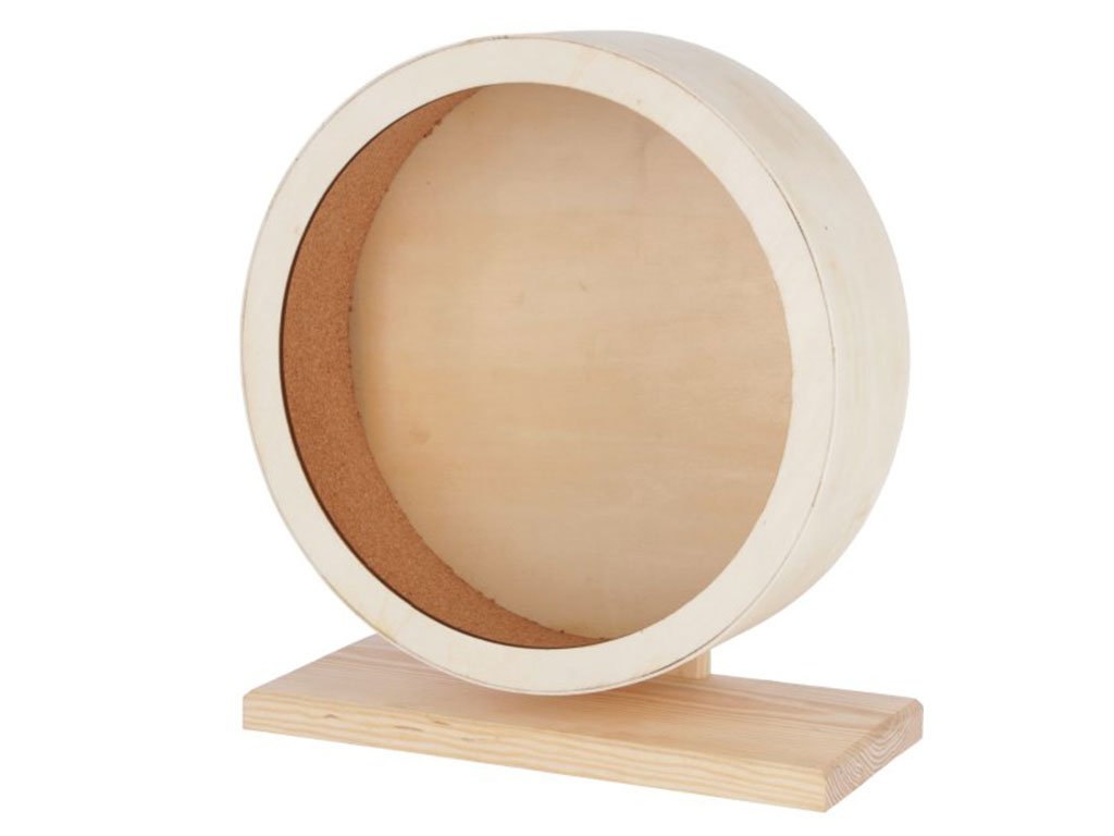 Kolotoč pro křečky a malé hlodavce, ze dřeva se širokou základnou, korková vrstva ve vnitřní ploše, uzavřená zadní stěna, rozměry 31,5x29x8 cm, průměr 29 cm.