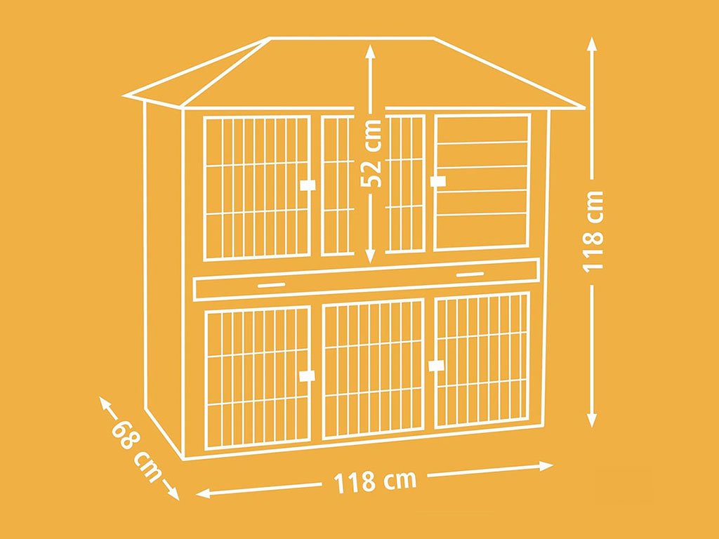 Dřevěná králíkárna pro králíky, morčata, činčily a jiné hlodavce o rozměrech 118x68x118 cm. Jedná se o praktickou králíkárnu s výběhem, která je vybavena vyjímatelným trusníkem pro snadné čistění. Bezproblémový přístup zajišťují čtyři přední dvířka na králikárně a výběhu.