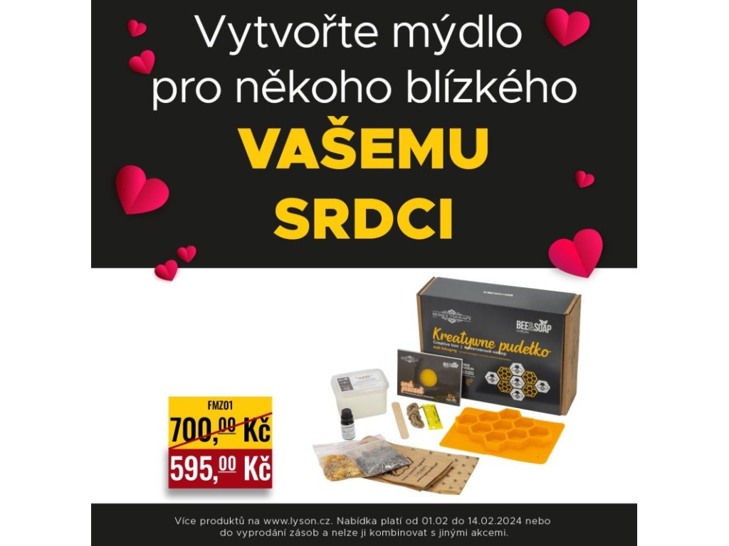 Inovativní včelí produkty Vítejte ve světě včelích a přírodních produktů BEE & SOAP LYSON a Honey Therapy. Nyní jsme naši nabídku rozšířili o inovativní ručně vyráběnou kreativní sadu. Díky němu získáte možnost vytvářet vlastní kompozice včelích mýdel na bázi glycerinu, květinové aromatické sušiny a jemných kosmetických přísad. Hlavní výhodou kreativního boxu je, že speciální formu můžete používat k výrobě mýdel opakovaně. Složení lze samozřejmě obměňovat vlastními řešeními, pokud jde o vůni nebo barvu výsledného produktu. Kromě toho se při přípravě mýdel používá med a včelí vosk. Díky vysokému obsahu vitamínů, aminokyselin, esterů a organických kyselin jsou tyto složky skutečnou výživovou bombou pro lidskou pokožku. Glycerinový základ vám poskytne podporu při rekonstrukci epidermis. Výhody kreativního boxu pro zdravotnictví Nezapomínejme, že kreativní box je navržen a určen pro celou rodinu - jeho používání doma umožní další integrační rozměr výrobku. Doporučujeme vám vyrábět mýdla společně s dětmi, přáteli a příbuznými. Může to být skvělá společná zábava pro všechny a zároveň to může mít skutečný dopad na aktivní budování environmentálního povědomí a postojů. Kreativní box umožní aktivity v tvůrčích dílnách, podnítí kreativitu a zvýší vzdělávací hodnotu u těch nejmenších. Výsledkem těchto tvůrčích činností budou ručně vyráběná mýdla. Takto přesně víme, čím si vlastně myjeme pokožku. Známe použité suroviny a navíc můžeme vypracovat recepty na jejich přípravu. Doba přípravy finálních výrobků je přibližně 15 až 20 minut. Skvělým a důmyslným řešením při přípravě mýdel bude použití dalšího aromatického koření jako složky jejich konečného obsahu. Je třeba zdůraznit vysokou účinnost mýdel. Díky svým vlastnostem pokožku po umytí nevysušují - zanechávají ji hydratovanou a regenerovanou. Perfektní řešení dárků s motivem včel Mýdla i samotná kreativní krabička mohou být skvělým dárkem ke zvláštním příležitostem, k Vánocům nebo na firemní akce - možností je mnoho - záleží jen na vašich potřebách. Navrhovaná kreativní sada je neobvyklý a inovativní produkt, který je k dispozici všem. Můžete s ním vytvořit poutavé, stylové a účinné produkty, které se postarají o vaši pleť. Kromě toho nabízíme komponenty, které tuto sadu rozšíří a doplní o mnoho nových možností kompozice. Formu, která je součástí sady, lze použít k výrobě dekorativních prvků ze surovin, jako je keramická omítka, kreativní beton, epoxidová pryskyřice, mýdlový základ, parafín, sójový vosk a palmový vosk. Síla květnaté louky a síla přírodních složek jsou dva klíčové prvky, na kterých stavíme vývoj nových produktů pro zdraví včel. Příroda přesně ví, co je pro nás dobré. Důvěřujte přírodě - důvěřujte značkám BEE & SOAP LYSON a Honey Therapy. Box zahrnuje: Speciální forma opakovatelně použitelná Mýdlová glycerinová báze Naturální med Včelí vosk Esenciální olej Sušene květiny Papír balící polopergamen Dekorační eko provázek Dřevěná špachtle Výhody produktu: - opakovaně použitelná forma z pružného a elastického materiálu - lehká a snadno použitelná (po dokončení práce lze mýdla z formy velmi snadno vyjmout) - rozšířená funkčnost formy - lze ji použít k výrobě voskových svíček i prvků z jiných dostupných materiálů - formy vhodné pro mytí v myčce nádobí - v nabídce jsou navíc k dispozici jedinečné vzory forem - díky sadě se mýdla snadno připravují a jsou bezpečná, bez potřeby dalších specializovaných nástrojů. Formát balení a prvků soupravy: hlavní balení: 330 x 240 100 mm silikonová forma: 160 x 220 x 21 mm glycerinový základ: 118 x 89 x 77 mm Hmotnost sad: FMZ01 - Kreativní krabička - Bee&Soap - Šestiúhelníky - 1,12 kg FMZ02 - Kreativní krabička - Bee&Soap - Květiny - 1,16 kg FMZ03 - Kreativní krabička - Bee&Soap - Smajlíci - 1,14 kg FMZ04 - Kreativní krabička - Bee&Soap - Malé šestiúhelníky - 1,09 kg