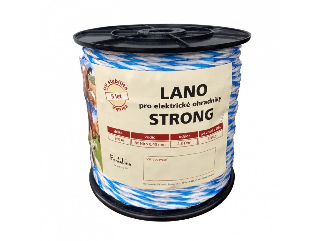 Ohradníkové lano STRONG vhodné pro ohrazení velmi dlouhých pastvin. Vodivost zajišťují Niro nerezové drátky 3x0,40 mm. Vodivé lano disponuje vysokou pevností v tahu. Je vyrobeno ze zesílených polyethylenových vláken (HDPE) s UV ochrannou, které vynikají svojí pevností a nízkou pružností, což zvyšuje odolnost proti popraskání.