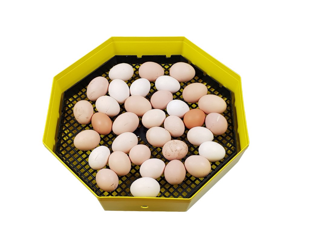 Kapacita bez otočného roštu: 60 slepičích, 120 křepelčích, 30 husích, 50 kachních nebo 70 bažantích vajec.