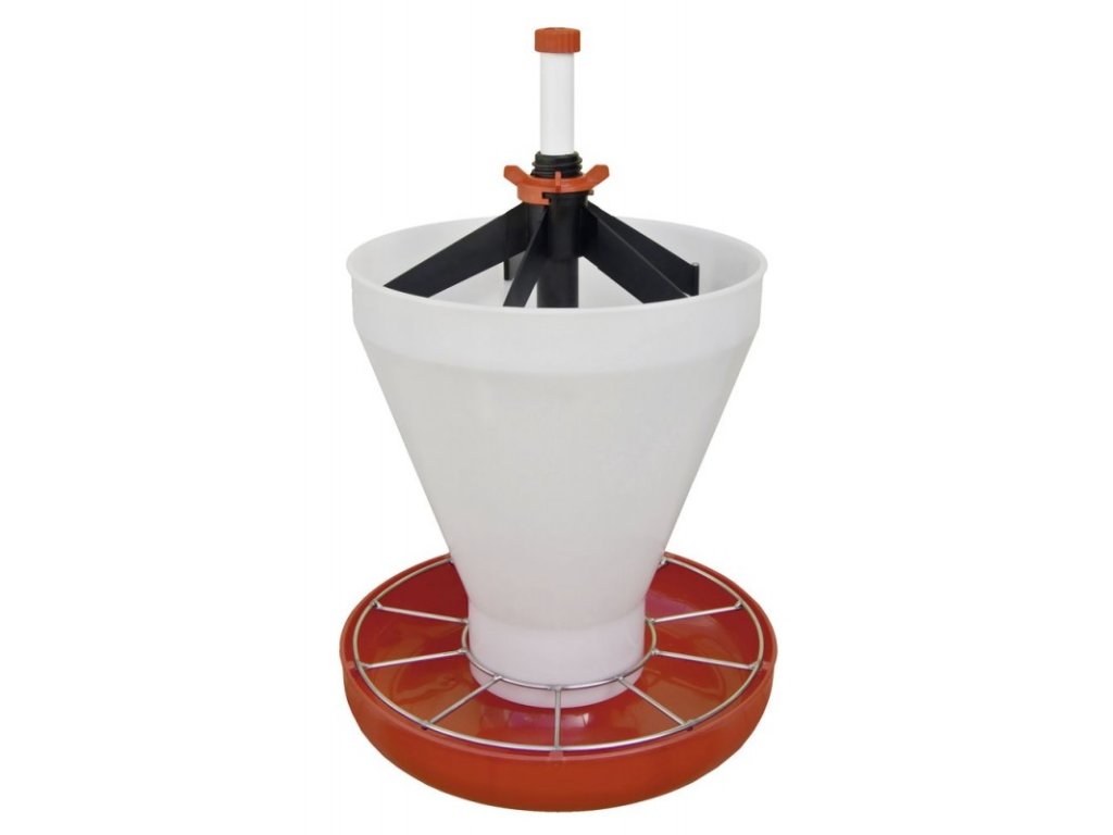 Krmná miska Maxi–click / Maxi Hopper Pan s násypkou pro selata po odstavu (v předvýkrmu) s násypkou slouží k podávání suché krmné směsi. Kotva pro snadné upevnění k roštu. Nerezová mřížka vymezuje 10 krmných míst.
