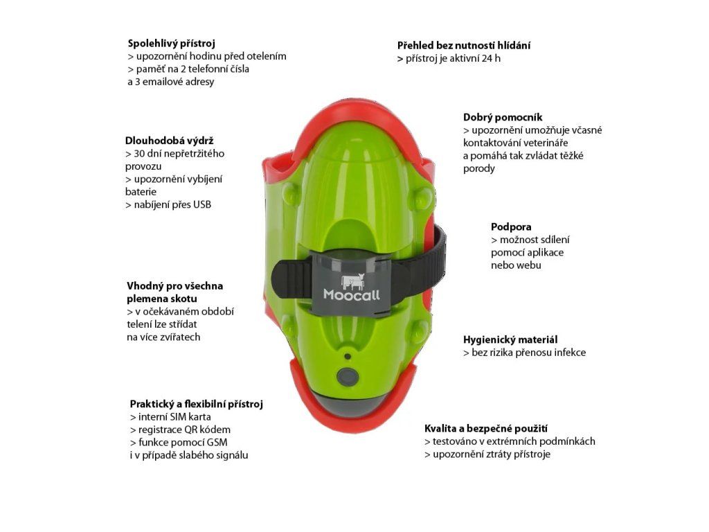 MooCall není jen obyčejné čidlo. Je to vysoce přesný monitorovací systém, který sleduje specifické pohyby ocasu způsobené porodními stahy. Včasné varování vám umožní v klidu připravit vše potřebné, případně včas volat veterináře u komplikovaných poloh. Jeden přístroj dokáže obsloužit 30–50 krav v sezóně.