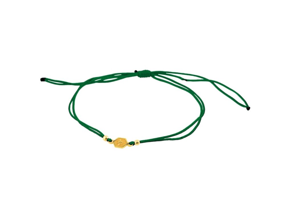 Náramek s včelou na hexagonu - zlacené stříbro, zelená šňůrka