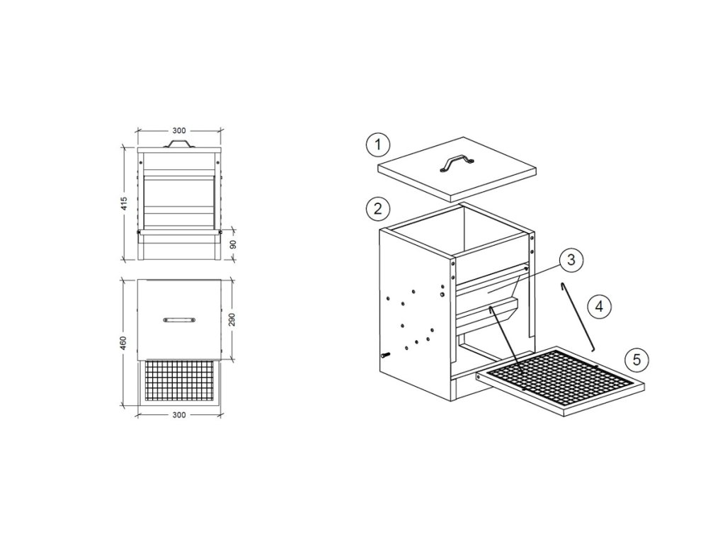 Vyrobené z odolného pozinkovaného plechu s precizním zpracováním zaručuje dlouhou životnost a jednoduchou údržbu. Nášlapný mechanismus funguje automaticky – po našlápnutí slepice se víko otevře a po jejím odchodu zase uzavře. Krmivo je tak chráněno před hlodavci, ptáky i nečistotami a nedochází k jeho ztrátám či znehodnocení.