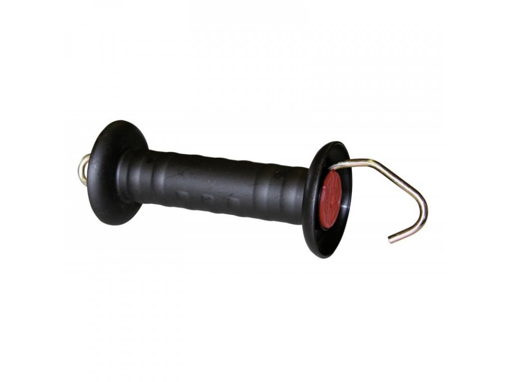Rukojeť ohradníkové brány pro elektrické ohradníky. Kovový háček umožňuje univerzální připojení na rolovací či pružinový systém.