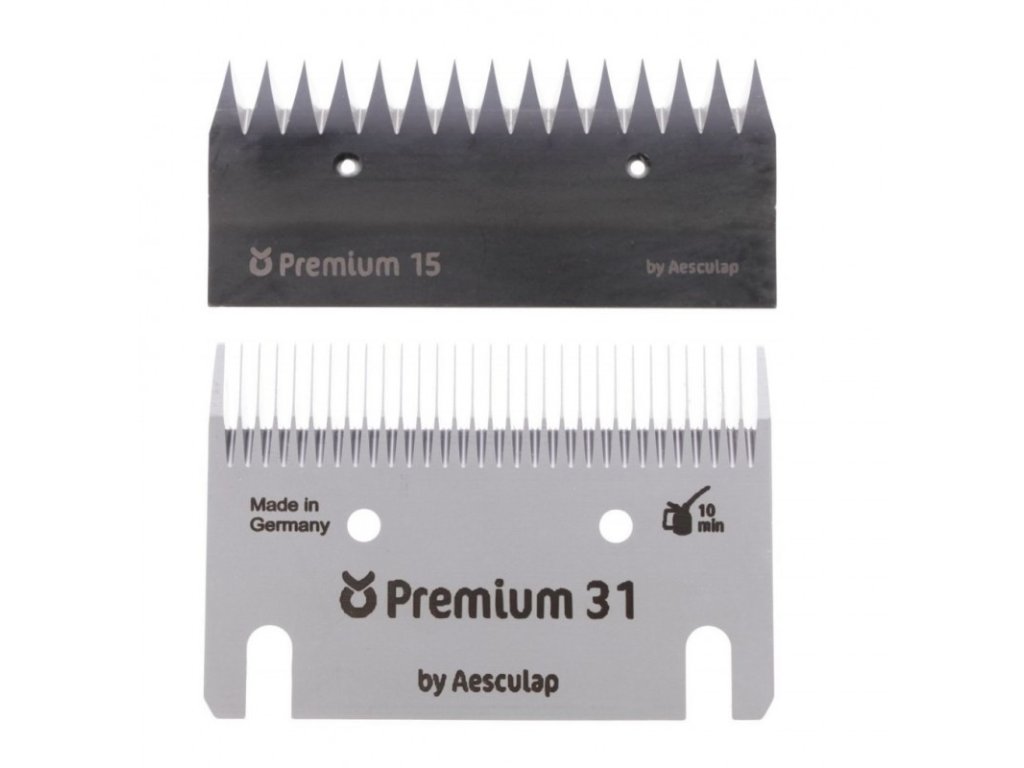 Sada náhradních nožů pro stříhací strojek pro koně a skot FarmClipper 4. Sada obsahuje vrchni čepel s 23 zuby a spodní čepel s 21 zuby.