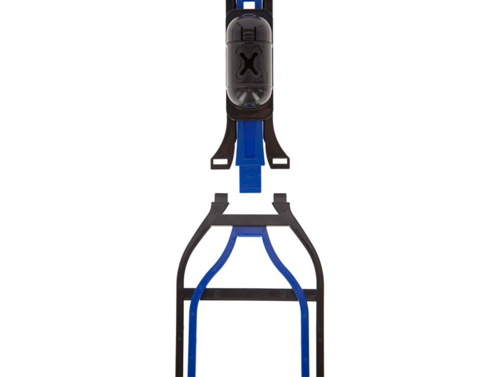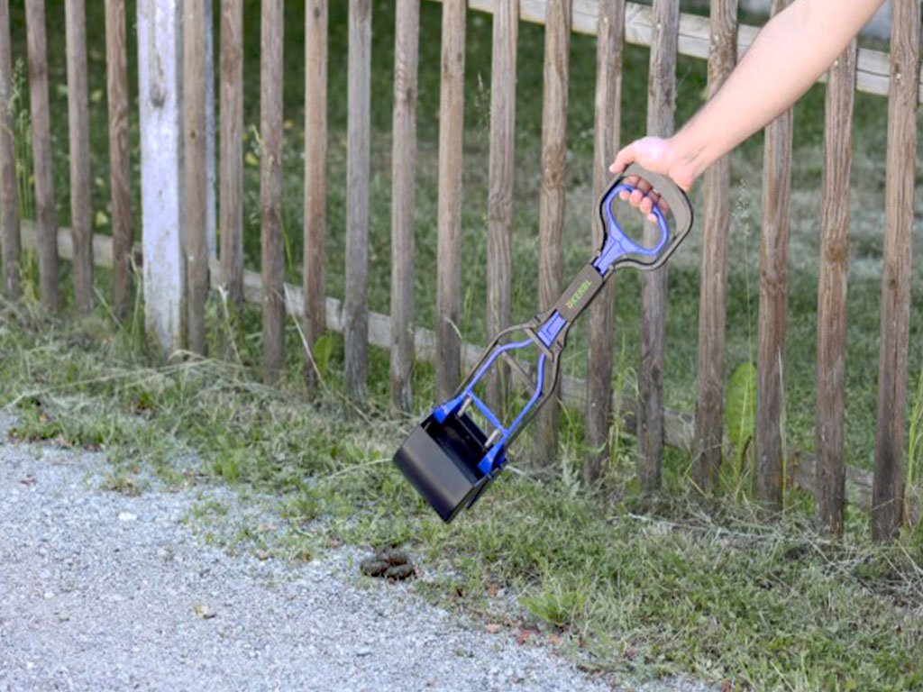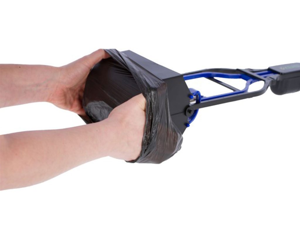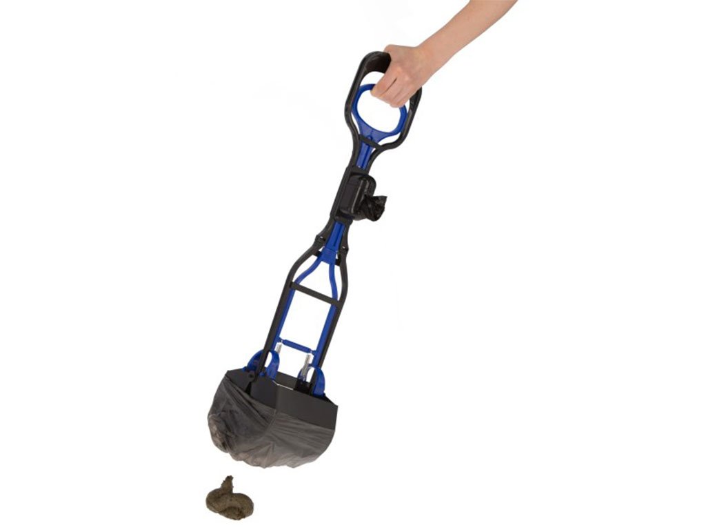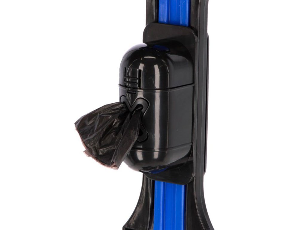 Sběrač na psí exkrementy, vhodný na všechny typy povrchů, s dávkovačem sáčků na výkaly, pružinový mechanismus, modro-černá barva, plastový materiál, rozměr 71 x 13 x 14 cm.