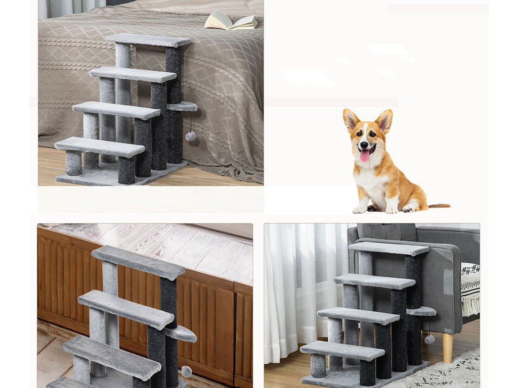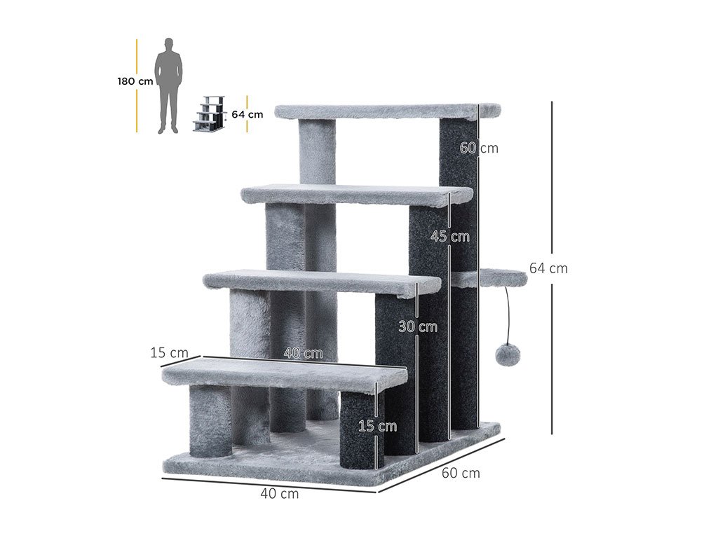 Schůdky pro psy a kočky, čtyřstupňové, pro snadné lezení, podšité měkkým plyšem, s měkkým míčkem, rozměry schodu 40x15 cm, celkové rozměry 60x40x64 cm.