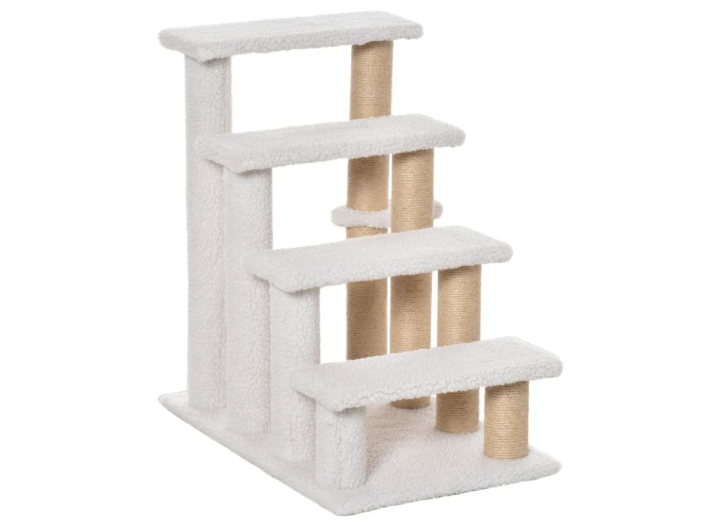 Schůdky pro psy a kočky, čtyřstupňové, pro snadné lezení, podšité měkkým plyšem, s odolným škrabadlem, s měkkým míčkem, rozměry schodu 40x15 cm, celkové rozměry 60x40x64 cm.