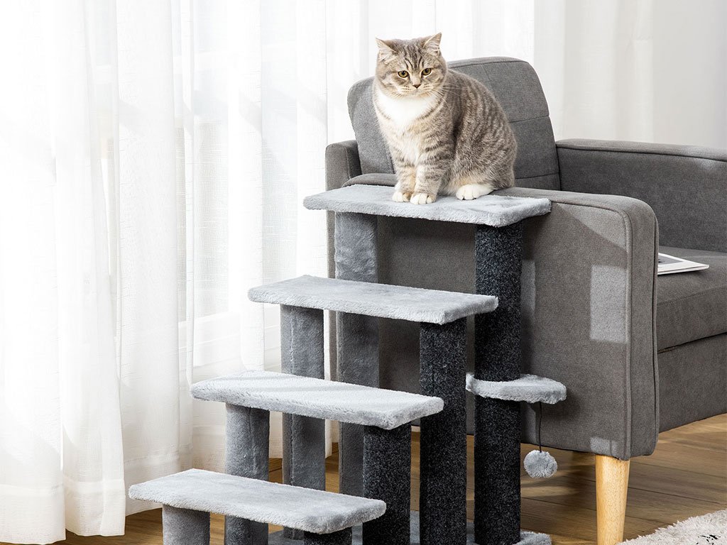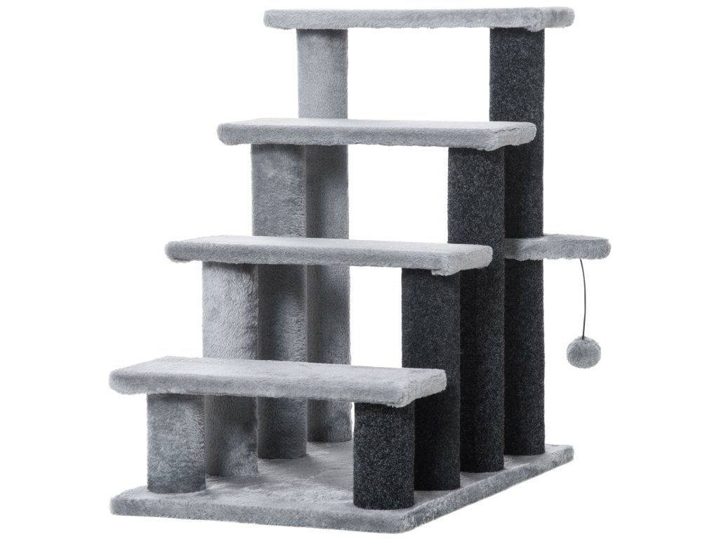 Schůdky pro psy a kočky, čtyřstupňové, pro snadné lezení, podšité měkkým plyšem, s odolným škrabadlem, s měkkým míčkem, rozměry schodu 40x15 cm, celkové rozměry 60x40x64 cm.
