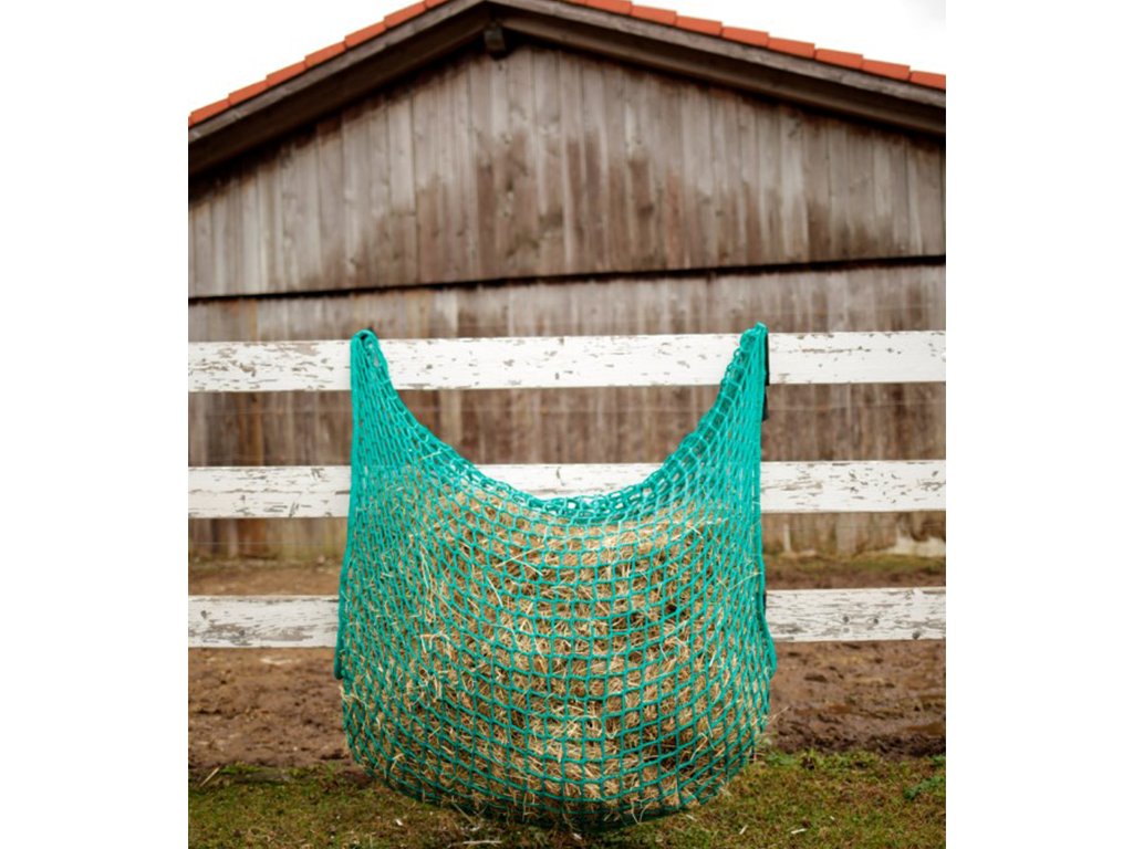 Síť na seno, velikost oka 4,5x4,5 cm, z extra silného materiálu, vhodný do výběhu, boxu, pastvinu, snadné připevnění - rychloupínací přezky, tloušťka lana 6 mm, kapacita 10 kg, rozměry 150x100 cm.