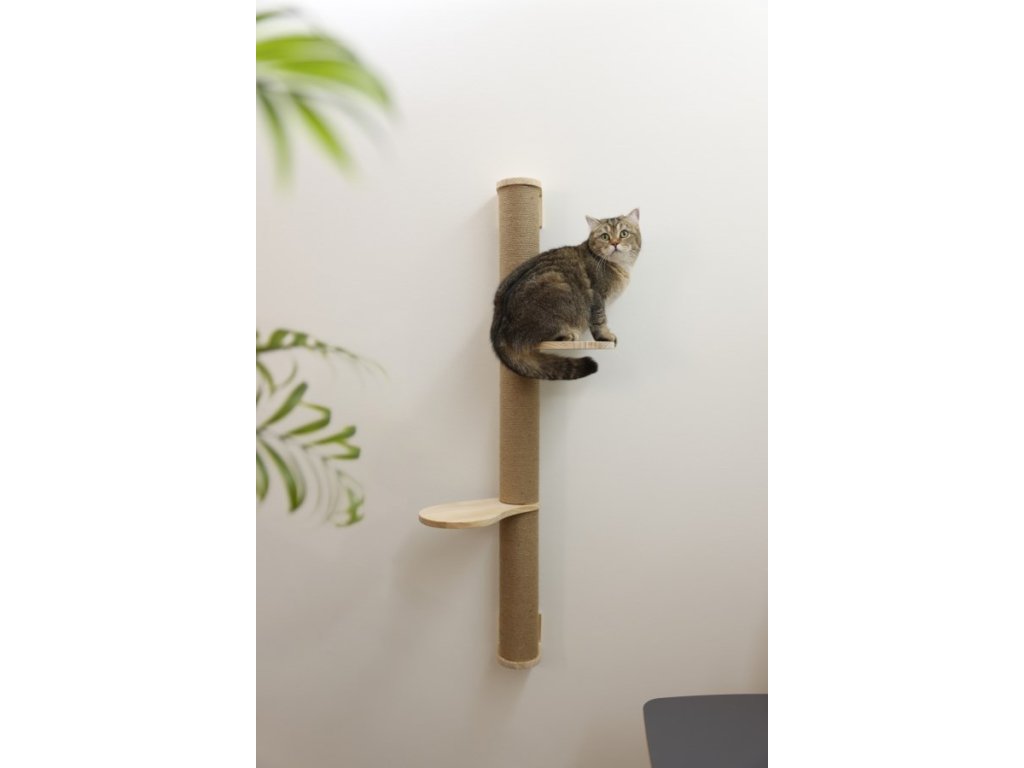 Nástěnný škrabací sloupek pro kočky je vyroben z masivního dřeva a obalený přírodním jutovým provazem. Dvě prostorné plošiny nabízejí kočkám pohodlné místo k odpočinku a pozorování okolí. Díky své konstrukci lze sloupek snadno připevnit na stěnu a slouží jako skvělé rozšíření stávajících kočičích škrabadel na zeď. Jutový povrch slouží kočkám k přirozenému broušení drápků a udržování jejich zdraví. Sloupek unese zátěž až 10 kg a je vhodný i pro více koček.