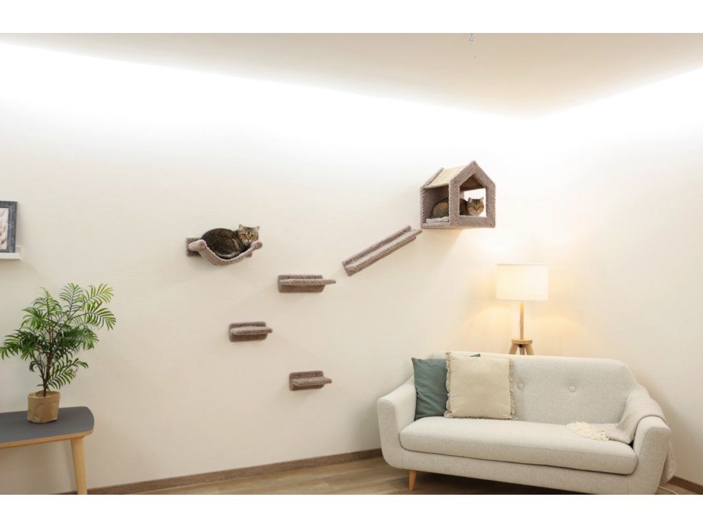 Kočičí strom Monte Baldo nabízí vašim mazlíčkům rozmanité možnosti pohybu i relaxace. Sestava obsahuje pelíšek, rampu, odpočívací police i houpací síť, které můžete rozmístit podle vlastního návrhu. Díky montáži na stěnu ušetříte místo a zároveň dopřejete své kočce prostor, který miluje – bezpečný výhled z výšky a možnost se protáhnout i vyřádit.