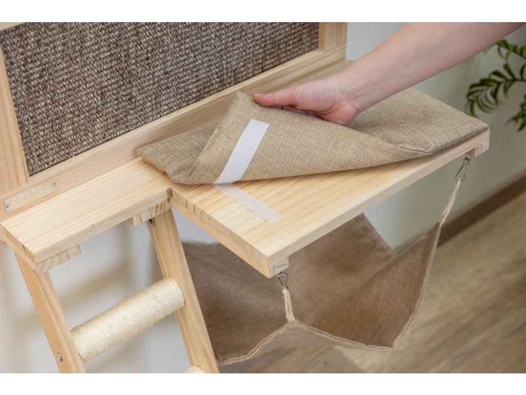 Škrabadlo pro kočky Timber je elegantní a praktické nástěnné odpočívadlo, které spojuje pohodlí, funkčnost a styl. Díky kombinaci odpočívací plochy s polštářem, sisalového škrabadla a závěsné houpací sítě poskytuje vaší kočce vše potřebné – prostor pro relaxaci, hru i péči o drápky.