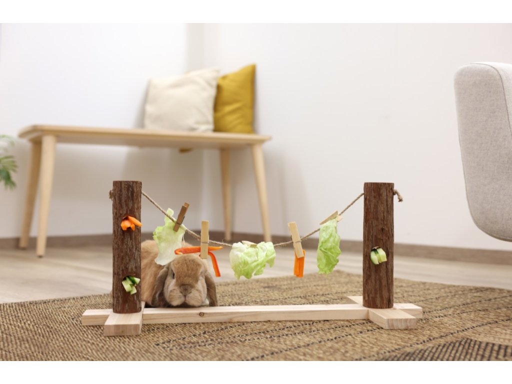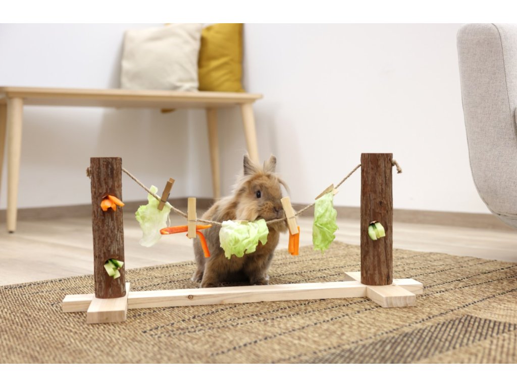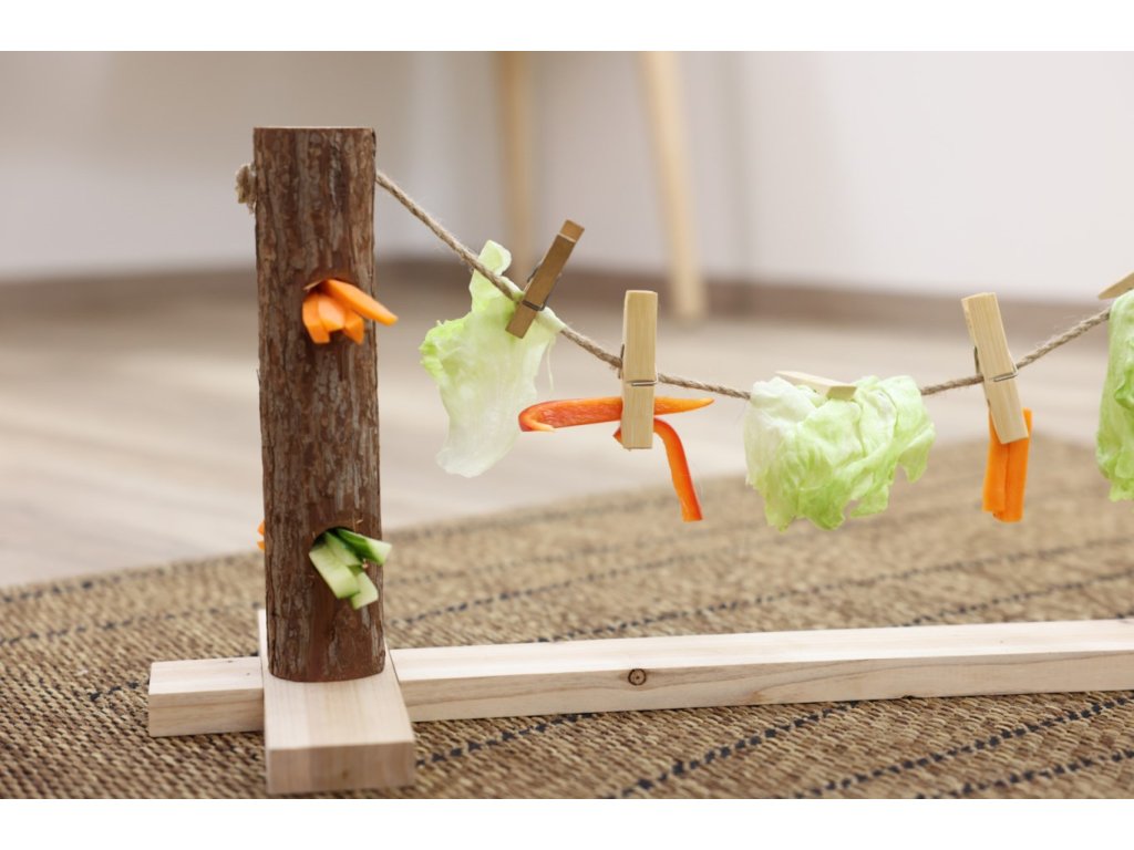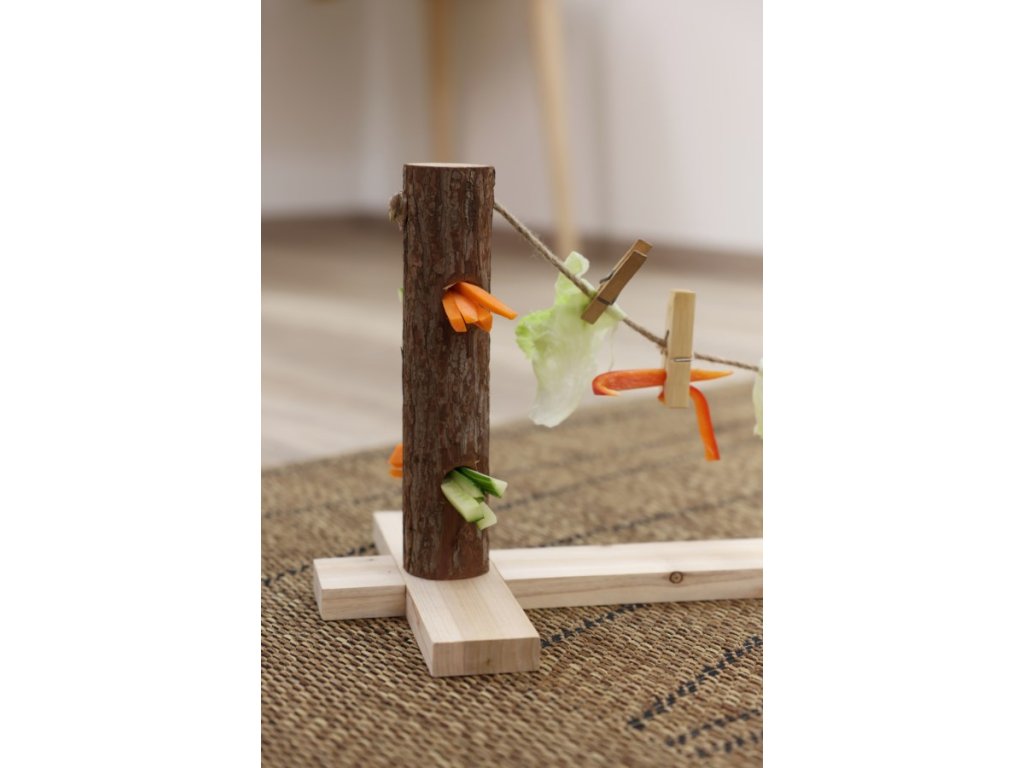 Krmná linie má pět kovových klipů, do kterých snadno uchytíte zeleninu – např. kousky mrkve, plátky papriky, okurky nebo listy salátu. Boční otvory v dřevěných kmenech slouží k doplnění dalších pamlsků, které zvířata musí svým čichem a dovedností objevit. Celý stojan stojí na stabilních dřevěných nožkách, takže se nepřevrací ani při větší aktivitě.