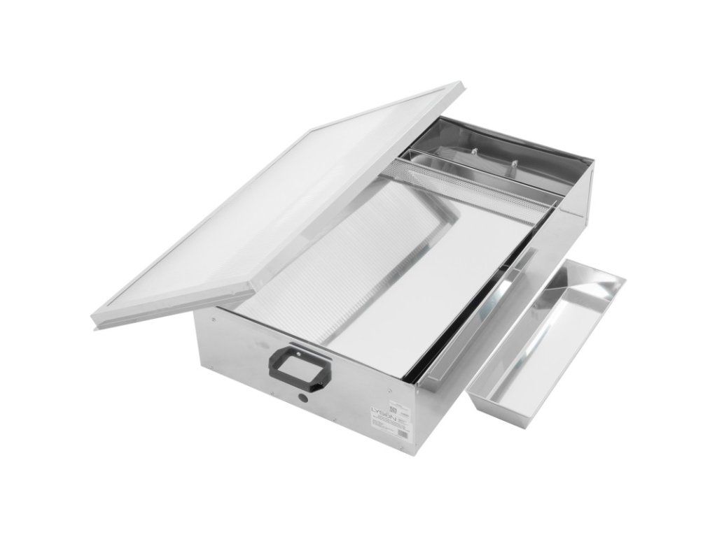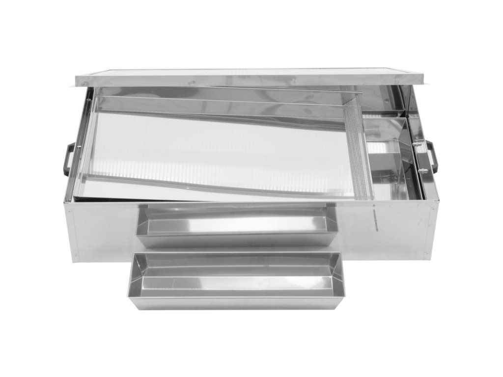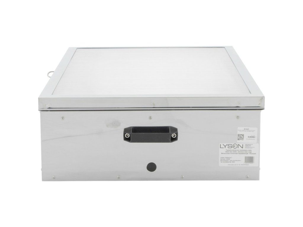 Profesionální solární tavidlo na vosk vyrobené z nerezové kyselinovzdorné oceli pro ekologické a efektivní vytavování včelího vosku pomocí sluneční energie. Ideální pro včelaře, kteří chtějí čistý a dezinfikovaný vosk bez použití plynu či elektřiny.
