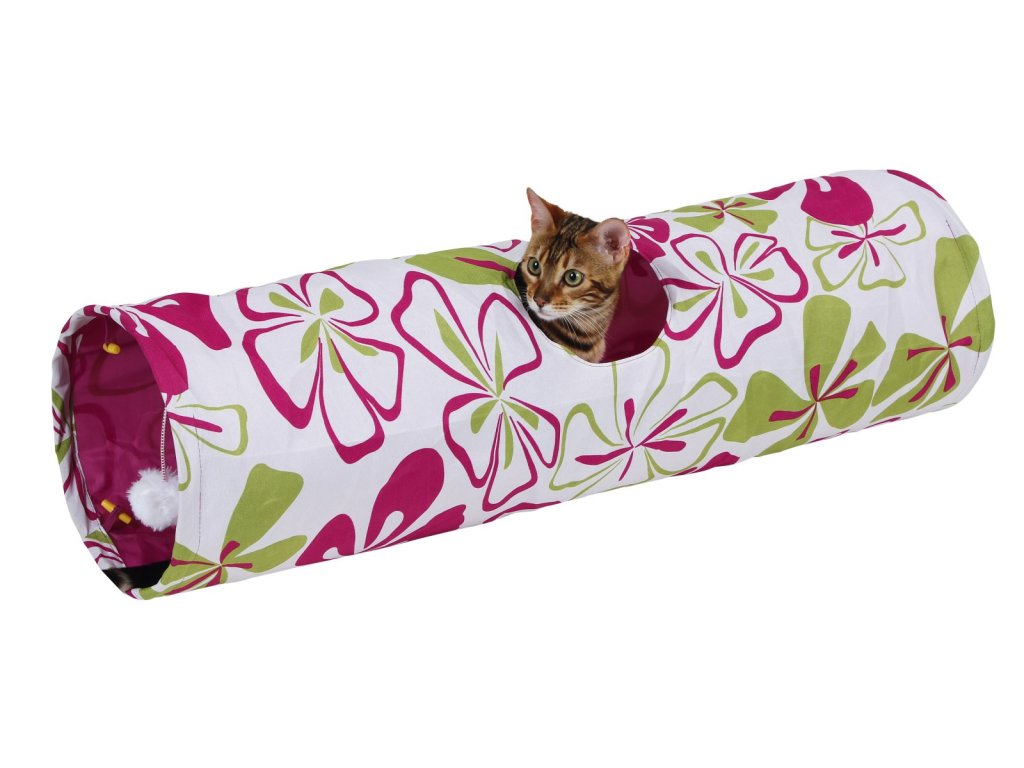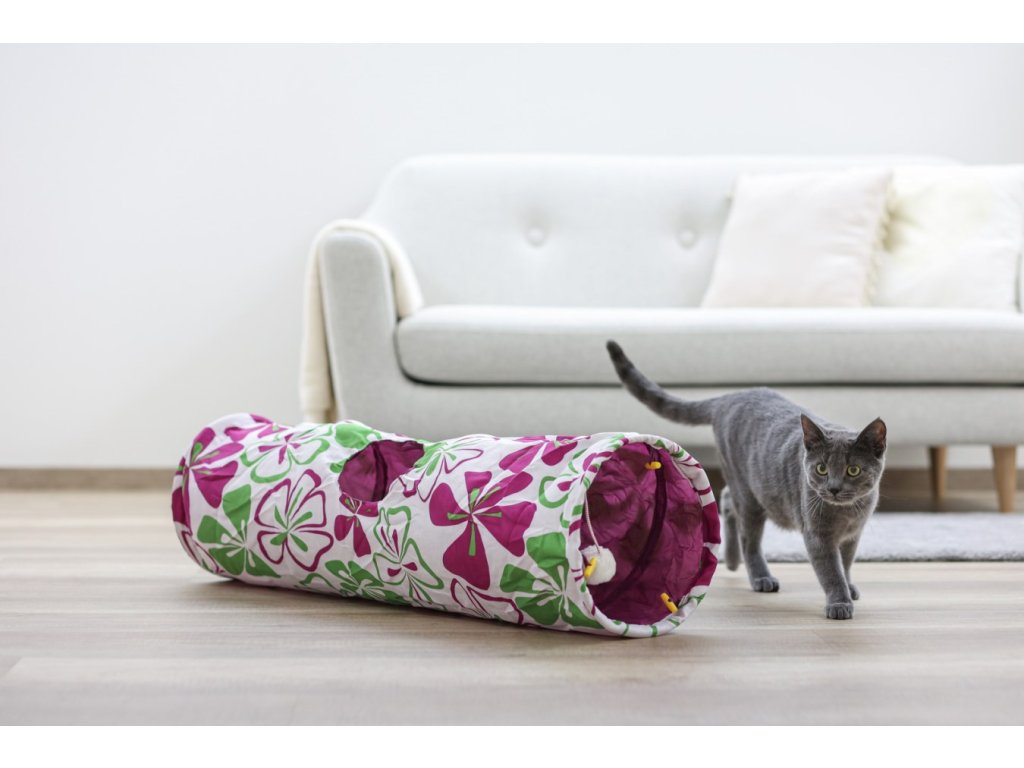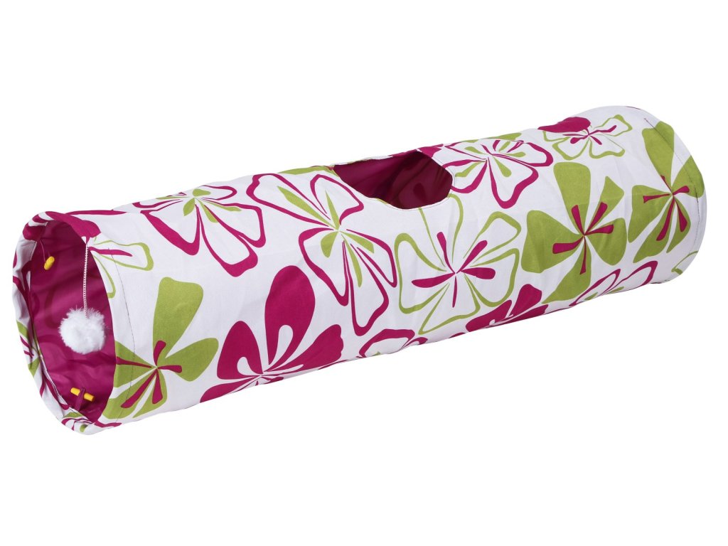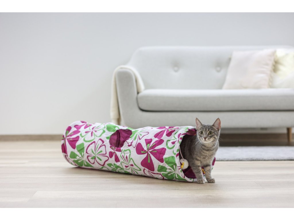 Tunel pro kočky Flower – barevná prolézačka s květinovým vzorem, která probouzí přirozený lovecký instinkt každé kočky. Díky třem vstupům, šustivému materiálu a zavěšené bambulce poskytuje spoustu zábavy, pohybu a úkryt pro odpočinek.