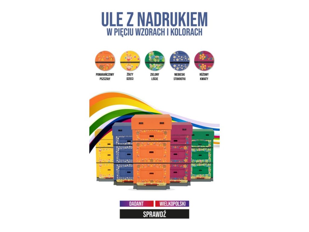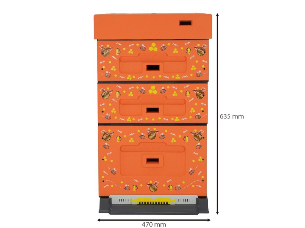 Úl Dadant OPTIMA, lakovaný (oranžový), potisk – včela, nekroucený Složení úlu Vnější rozměry (mm) Vysoká střížka s větráním Dadant 470x538x97 1 x nástavek Dadant Optima, nekroucený 450x523x310 2 x nástavek 1/2 Dadant Optima, niekroucený 450x524x175 Plastové hygienické dno - OPTIMA 455x567x73 Průhledný strůpek Dadant 417x487 šířka x délka x výška Výhody úlů s potiskem: jedinečná estetika ochrana proti oděru pomocí UV laku dlouhotrvající barevnost Tyto úly jsou nejen funkčním nástrojem ve včelíně, ale také výrazem estetiky a individuality ve včelařství.